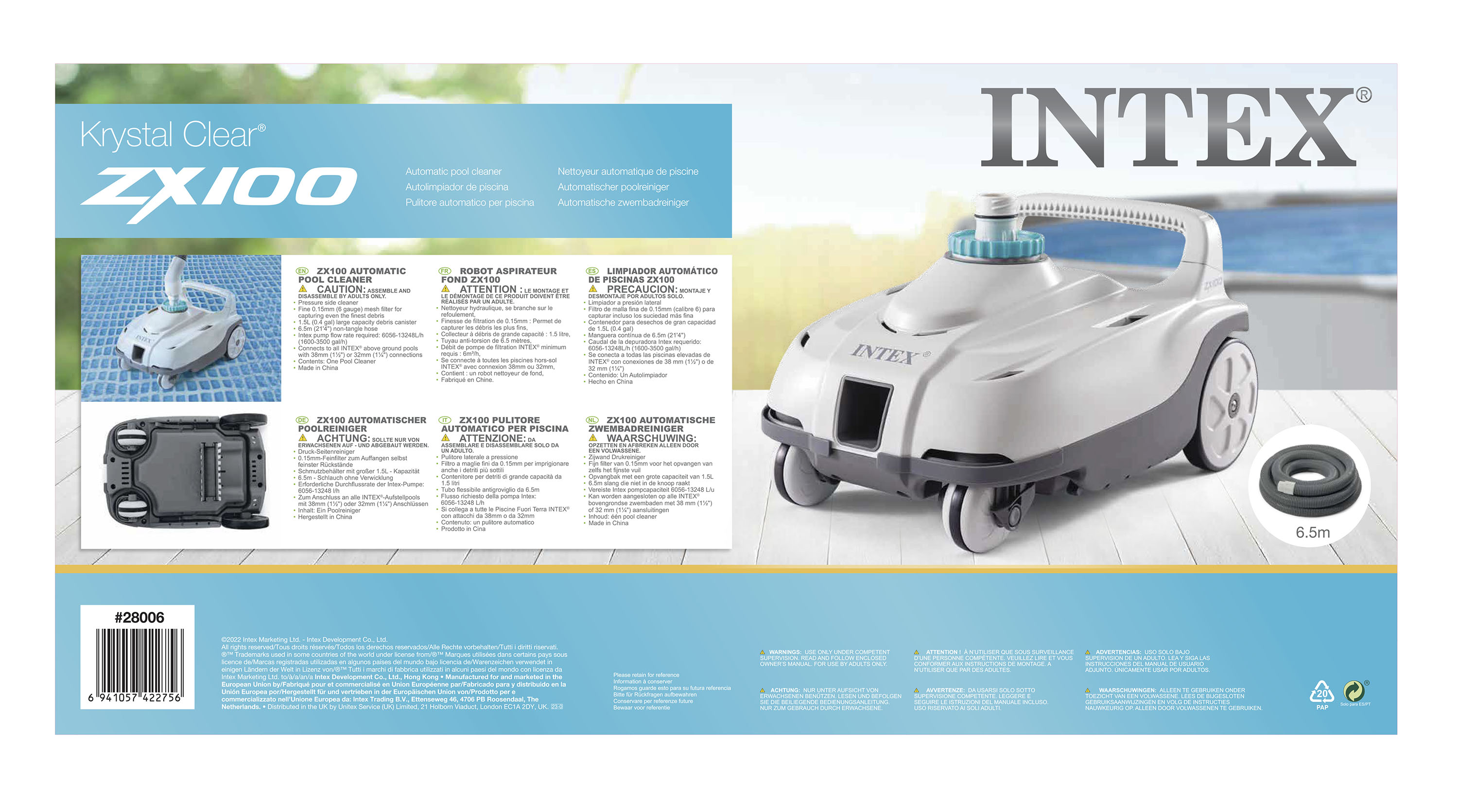 The INTEX� ZX100 is an ultra-convenient pressure-side automatic floor cleaner, convenient maintenance for spas and pools up to 18ft. Simply�connect�to the pool inlet fitting, and the suction is generated within the cleaner itself.�Say goodbye to debris while it easily picks up leaves, dirt, sand, and bugs directly in a large capacity collection tray with a convenient carry handle. Engineered with oversized wheels that rotate in one direction to maintain an efficient cleaning path. Designed with a new angled hose elbow and swivel joint for no hose tangle and less hassle. Keep your pool clean all summer long.