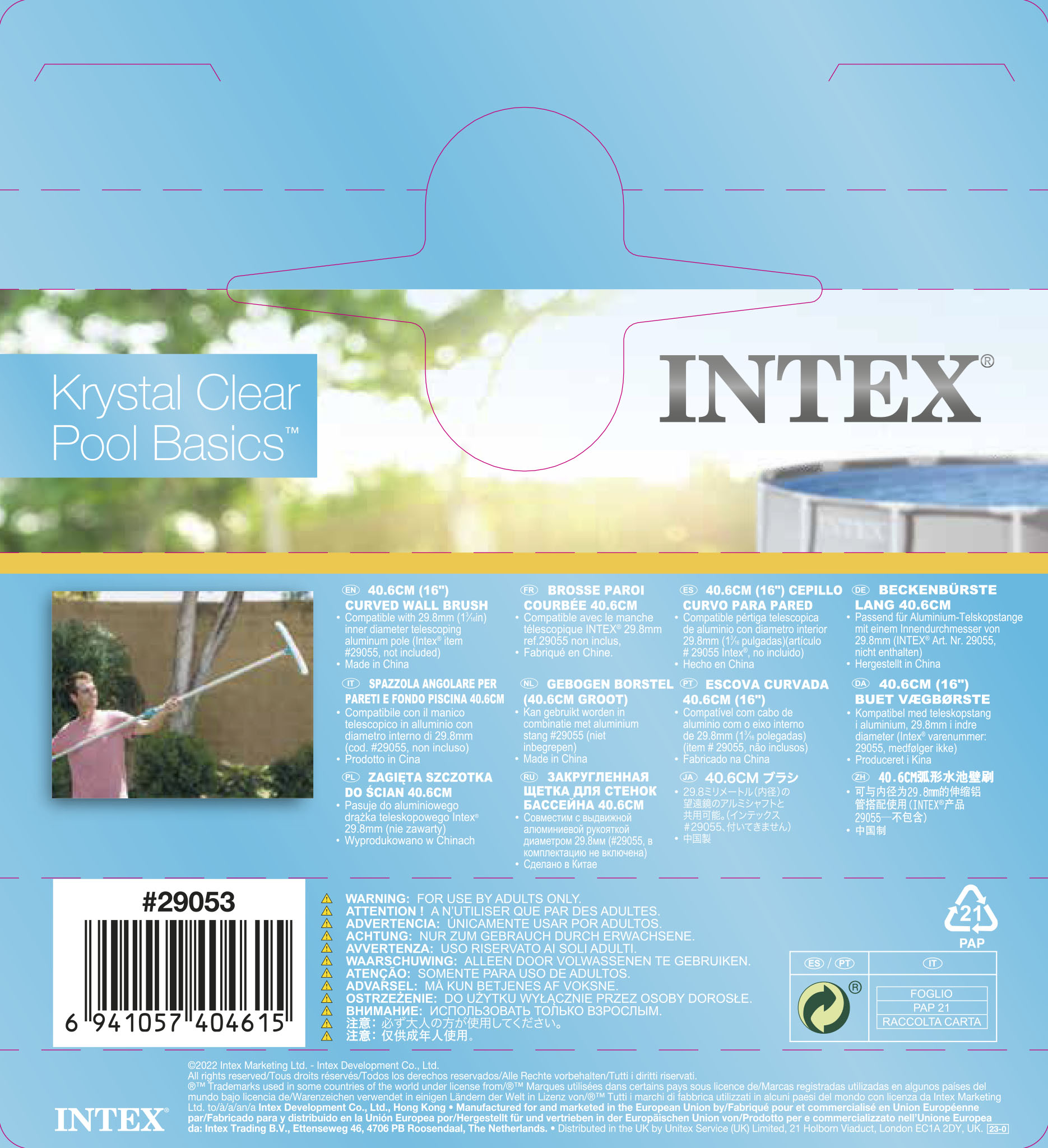 - Easily and quickly remove algae and grime from pool walls or the pool floor with the Intex� 16in Curved Wall Brush. The convenient curved brush shape is ideal for pool cleaning and maintenance. The brush is compatible with the 29.8mm inner diameter telescoping aluminum shaft (sold separately).Curved brush ideal for pool cleaning and maintenanceQuickly remove algae and grime from pool walls or floorCompatible with 29.8mm inner diameter telescoping aluminum pole (item# 29055, sold separately)