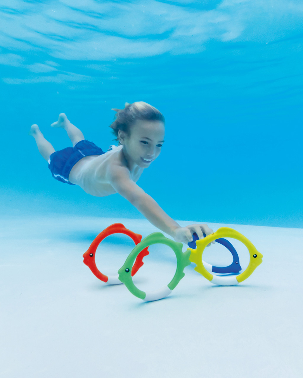 Have an exciting and competitive play in your pool this summer with our Underwater Fish Rings. It’s as simple as the toss of a few rings in bright shades of green, orange, yellow and blue. The rings are made with soft flexible material for safety.