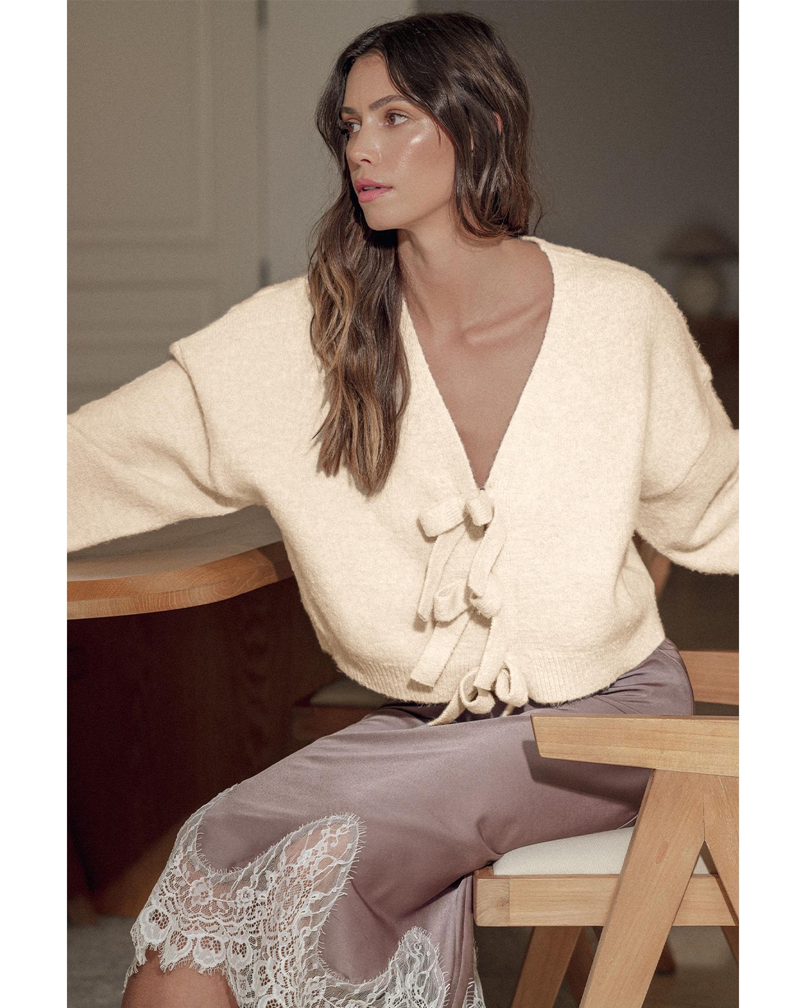 Jet Stream Bowknot Front Loose V Neck Knitted Cardigan – L