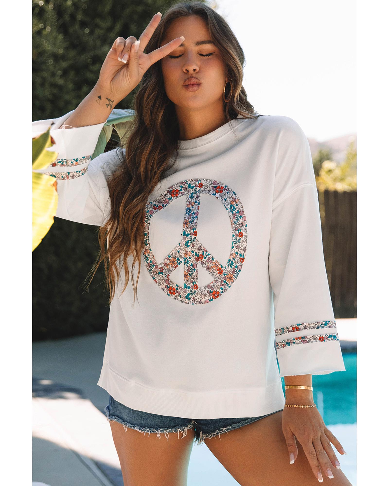Jet Stream Floral Peace Sign Graphic Drop Shoulder Wide Sleeve Casual Top – M