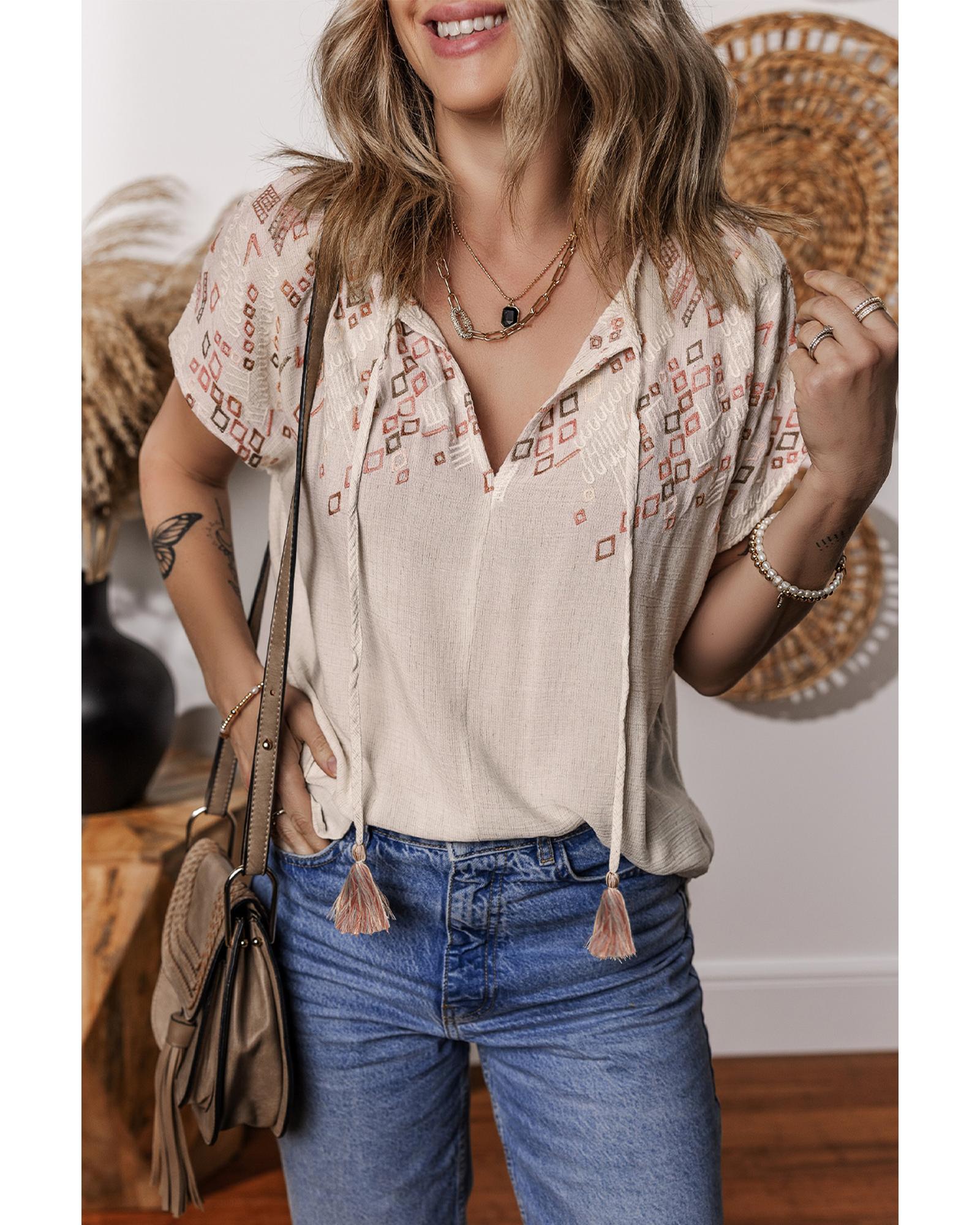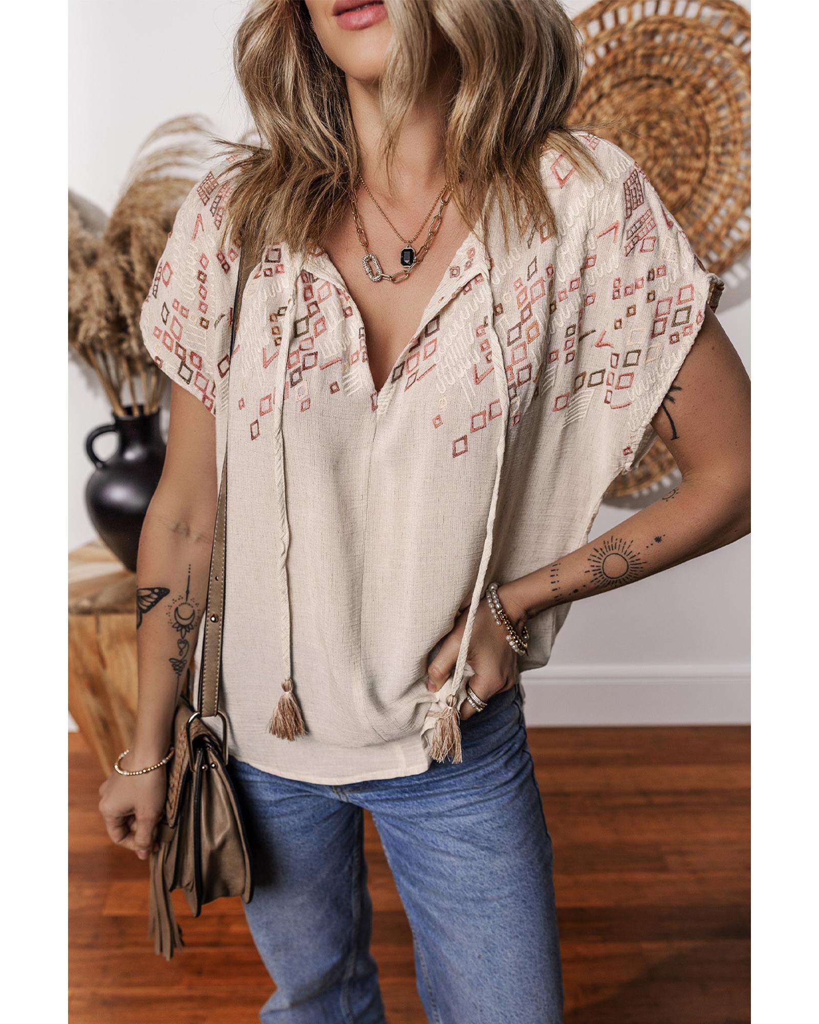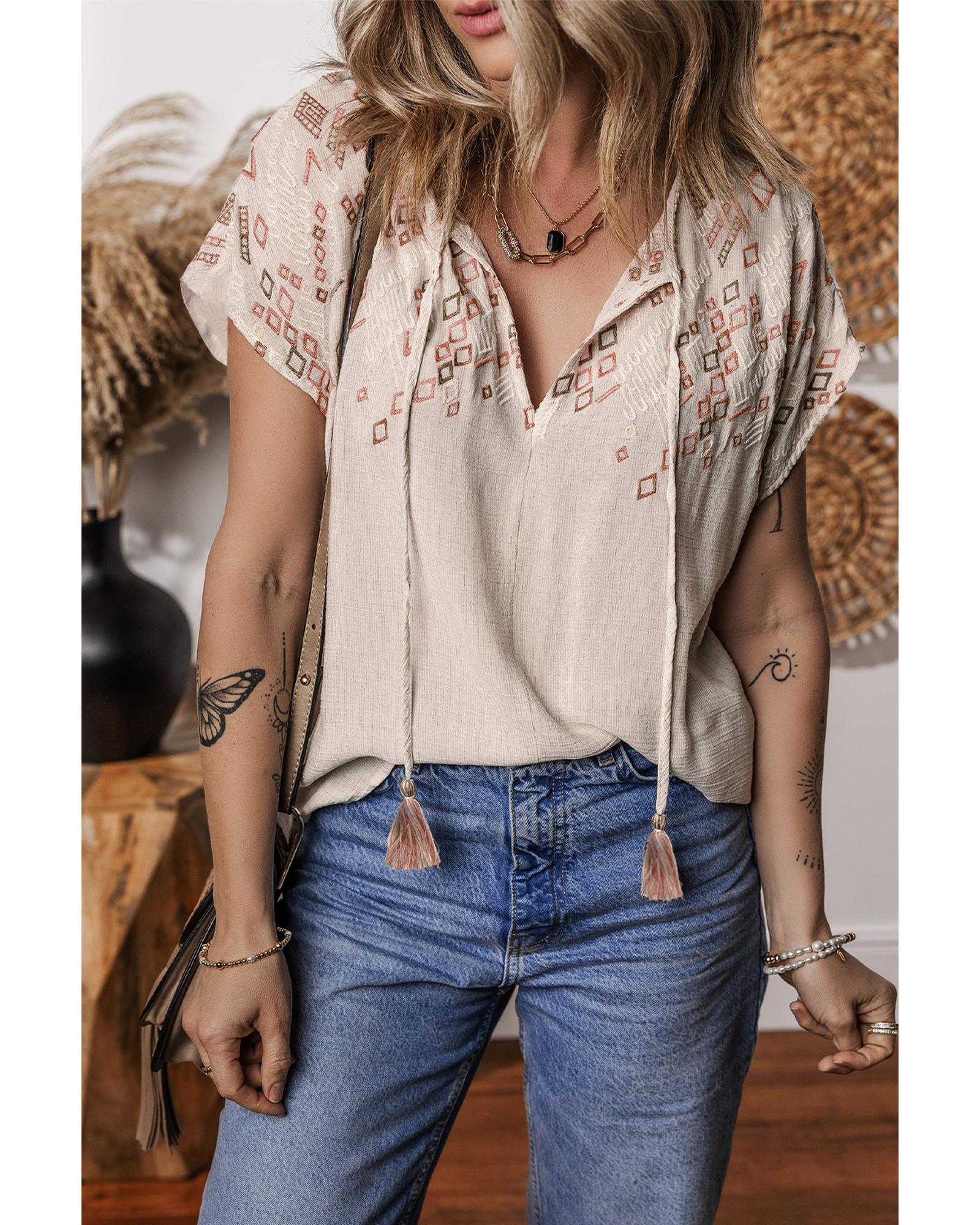 - Jet Stream Geometric Embroidered Short Sleeve Tassel Tied V Neck Blouse