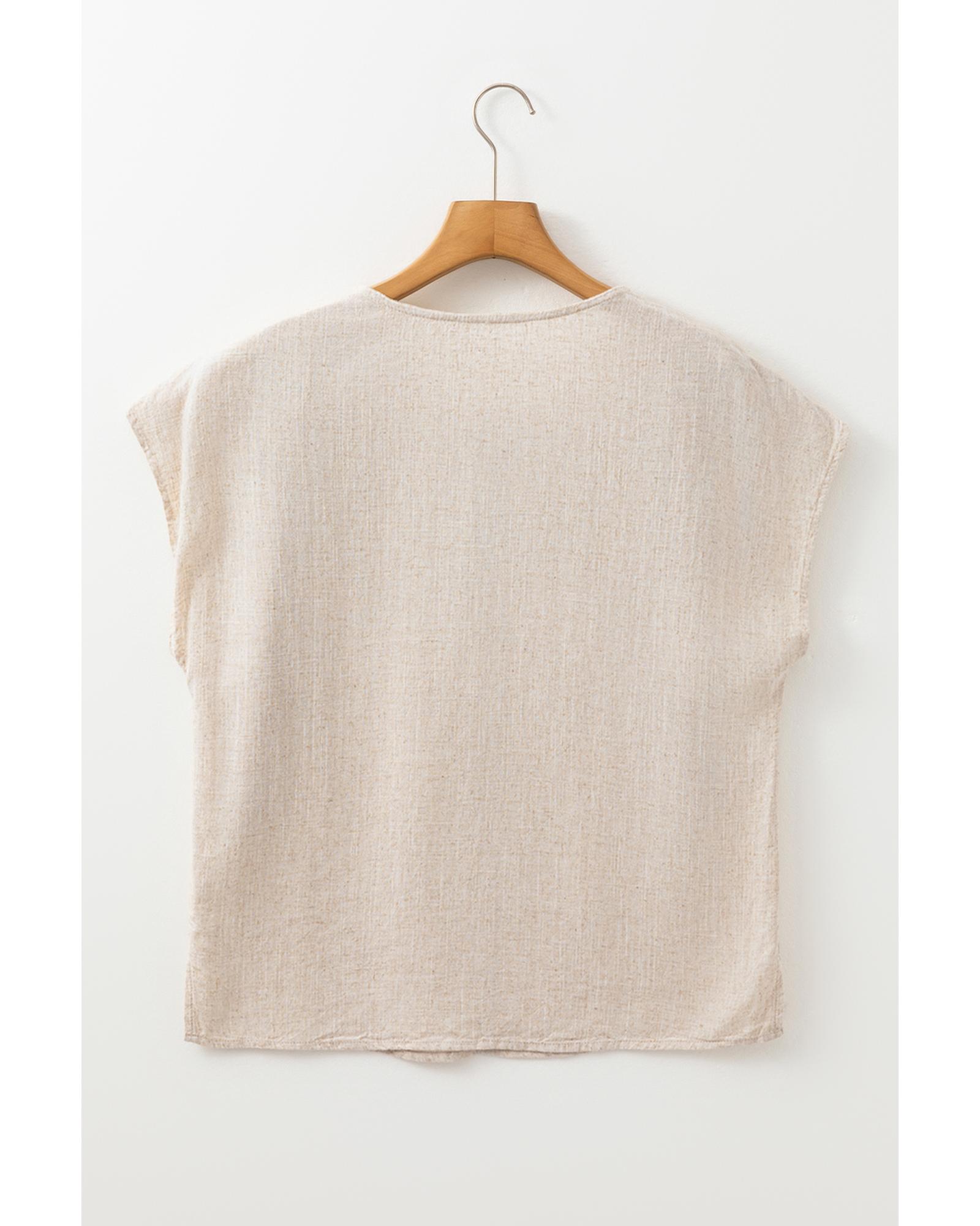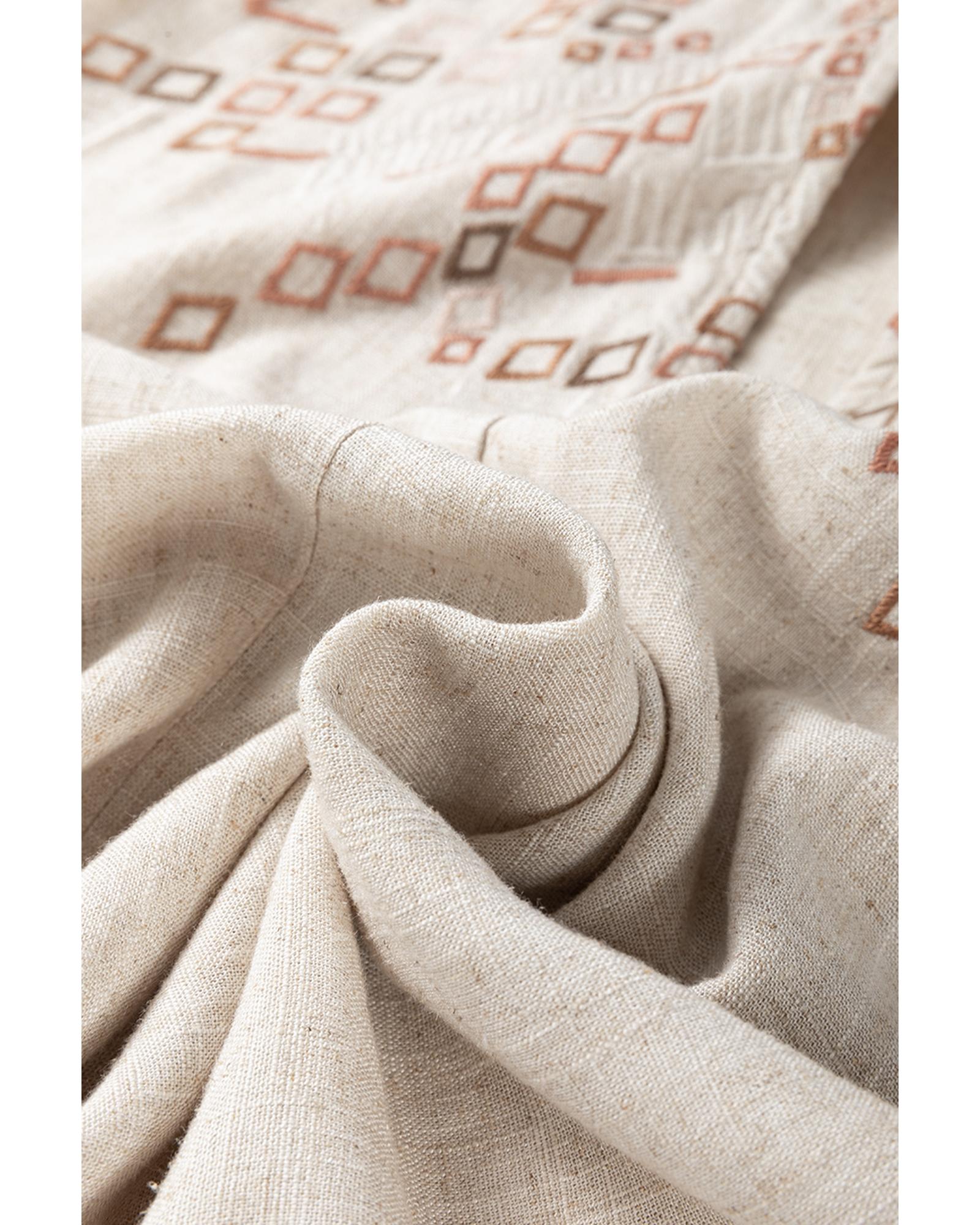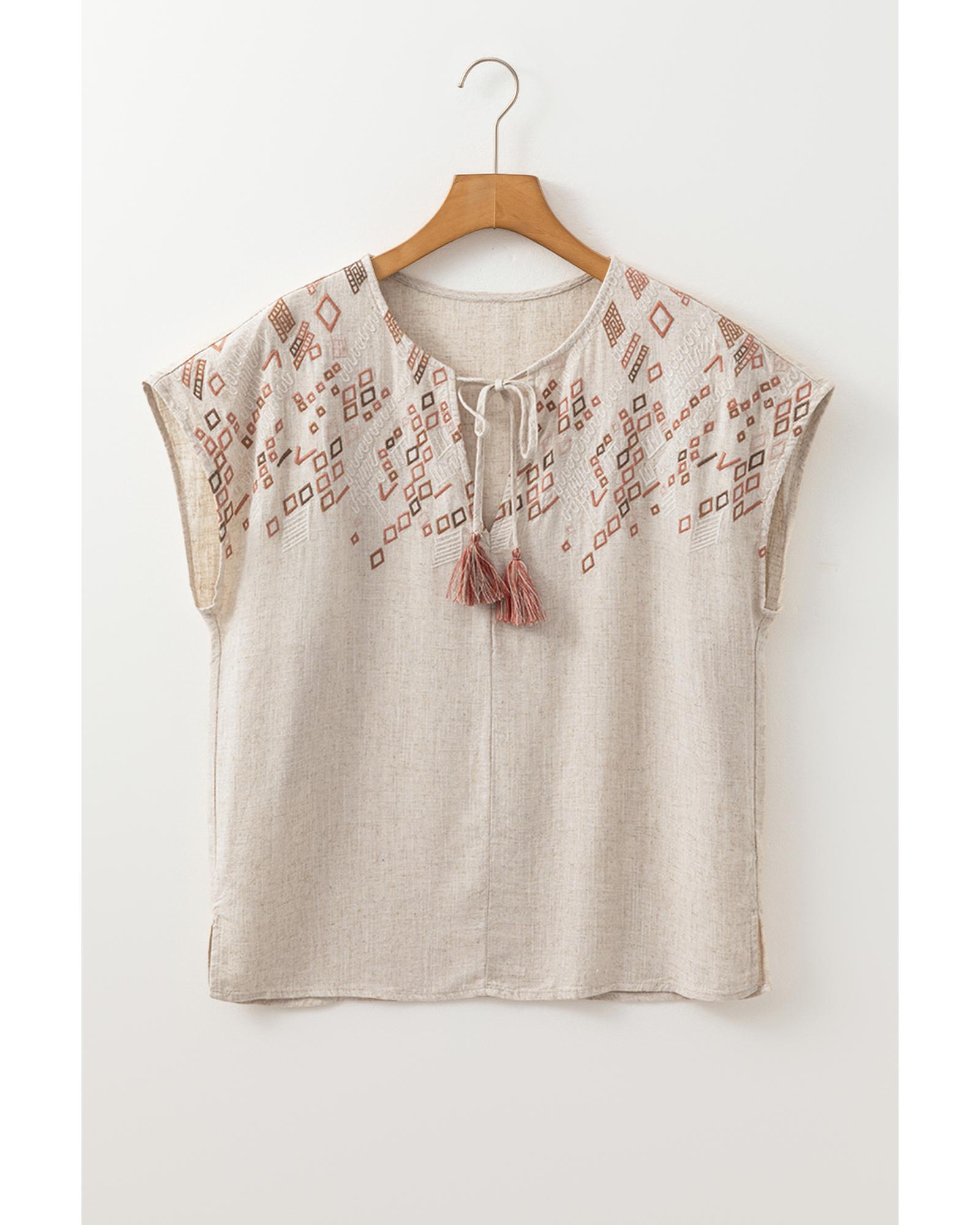 - Jet Stream Geometric Embroidered Short Sleeve Tassel Tied V Neck Blouse