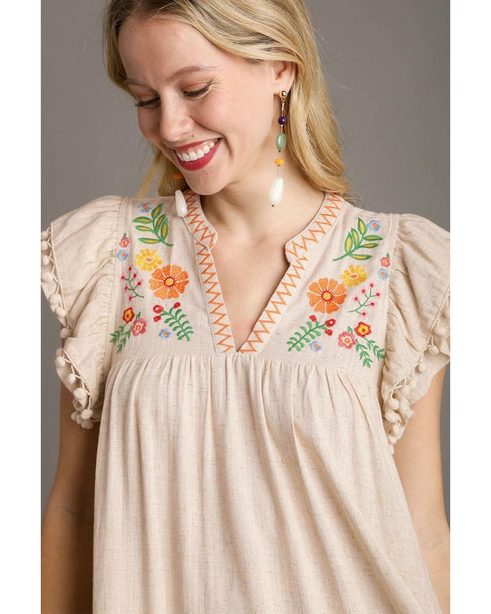 Jet Stream Linen Embroidery Split Neck Pom Pom Ruffle Sleeves Flowy Short Dress – S