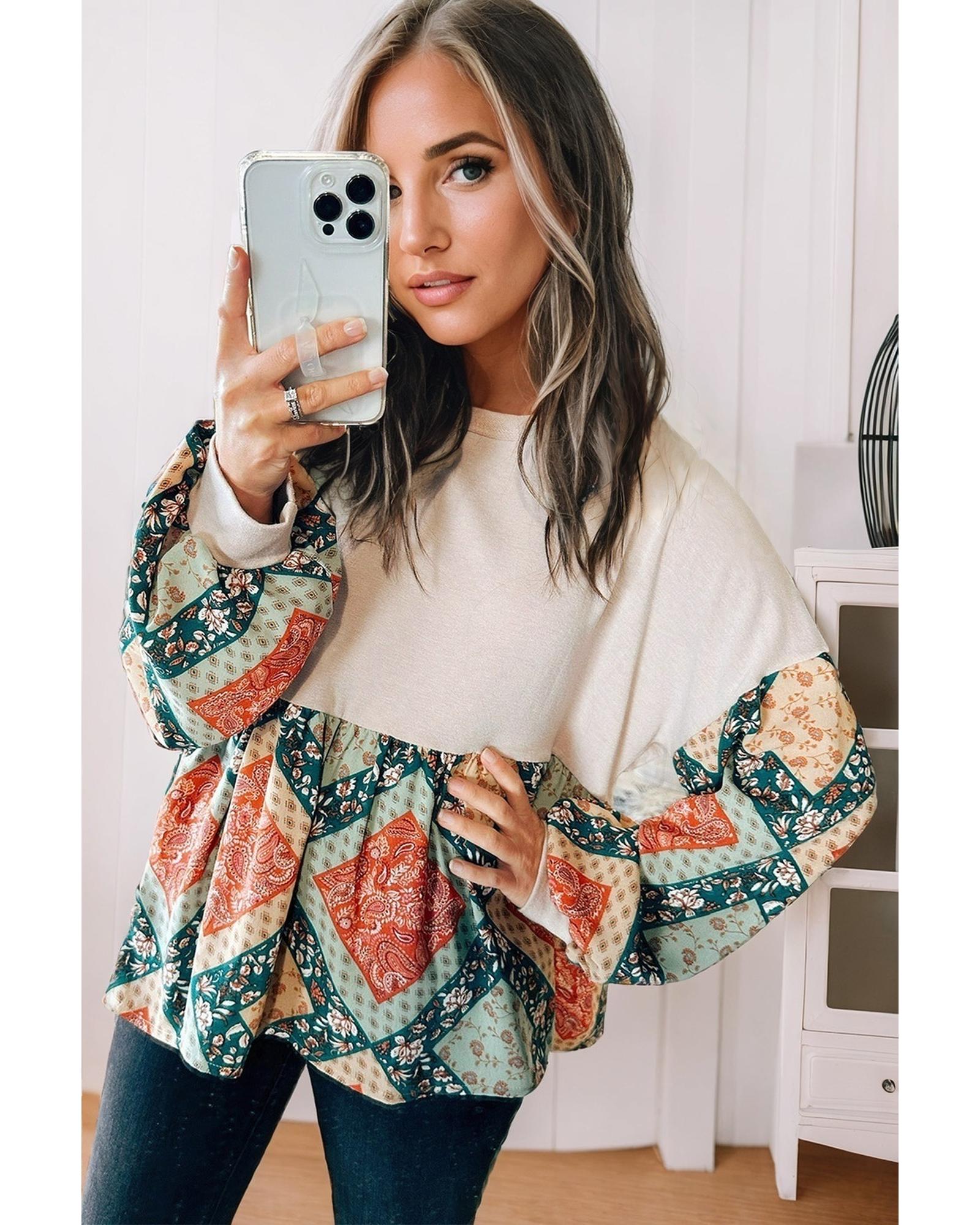 Jet Stream Paisley Geometric Patchwork Crew Neck Loose Fit Top – S