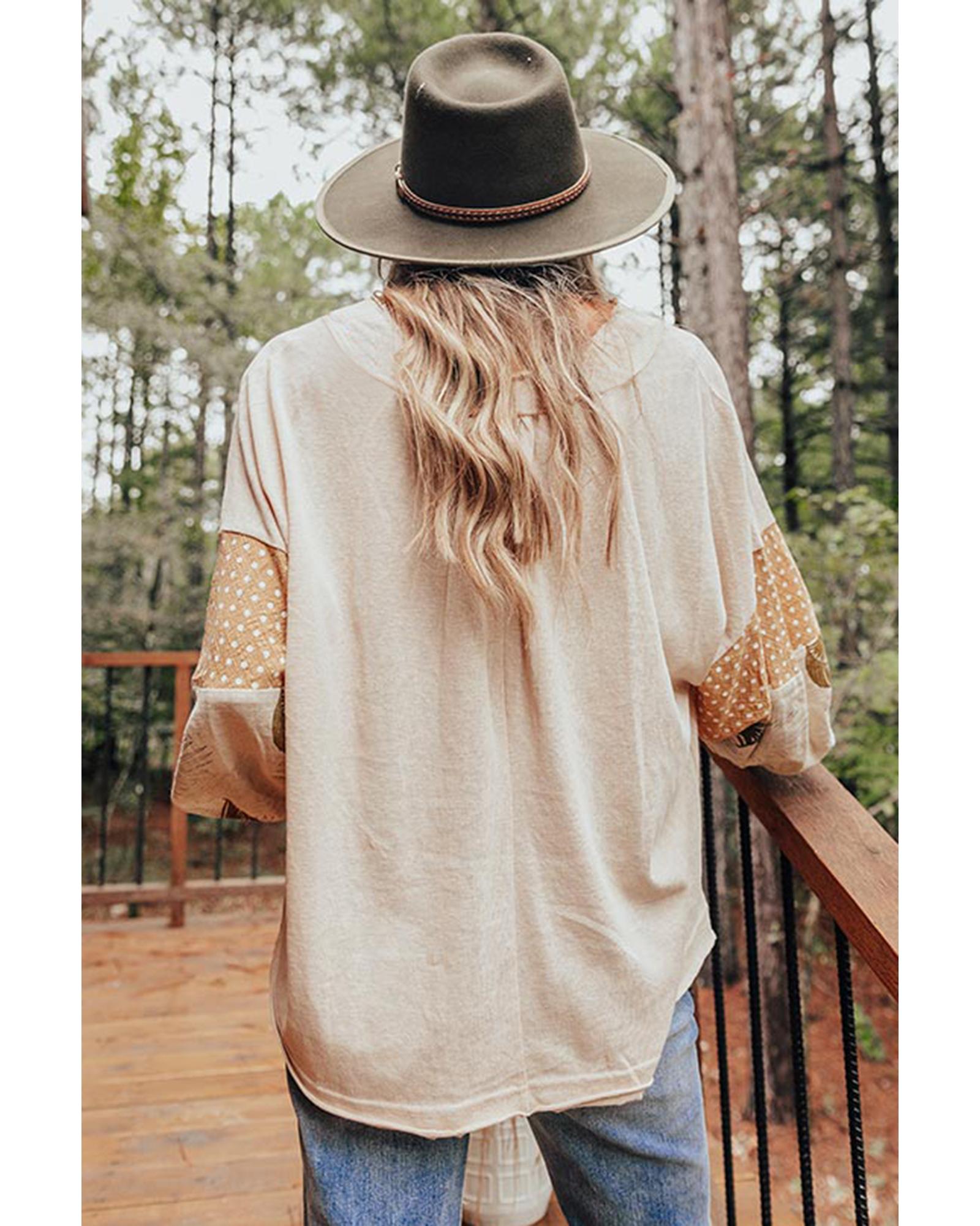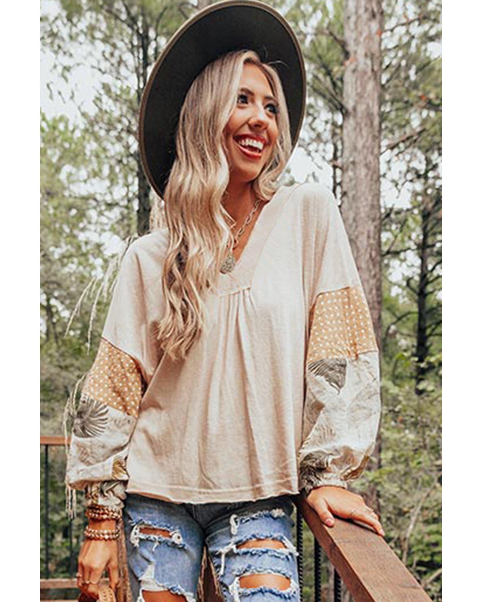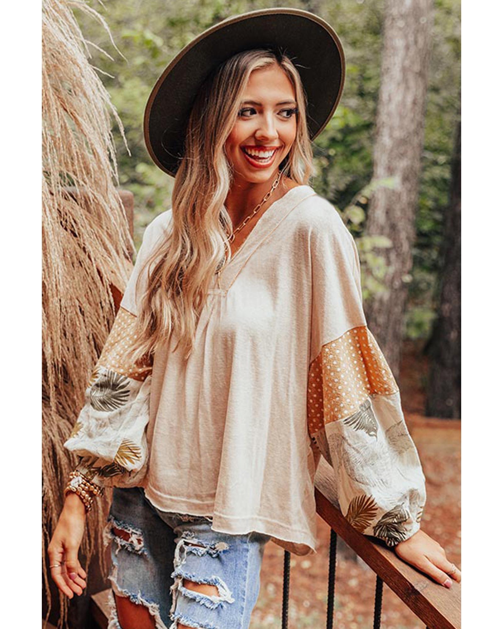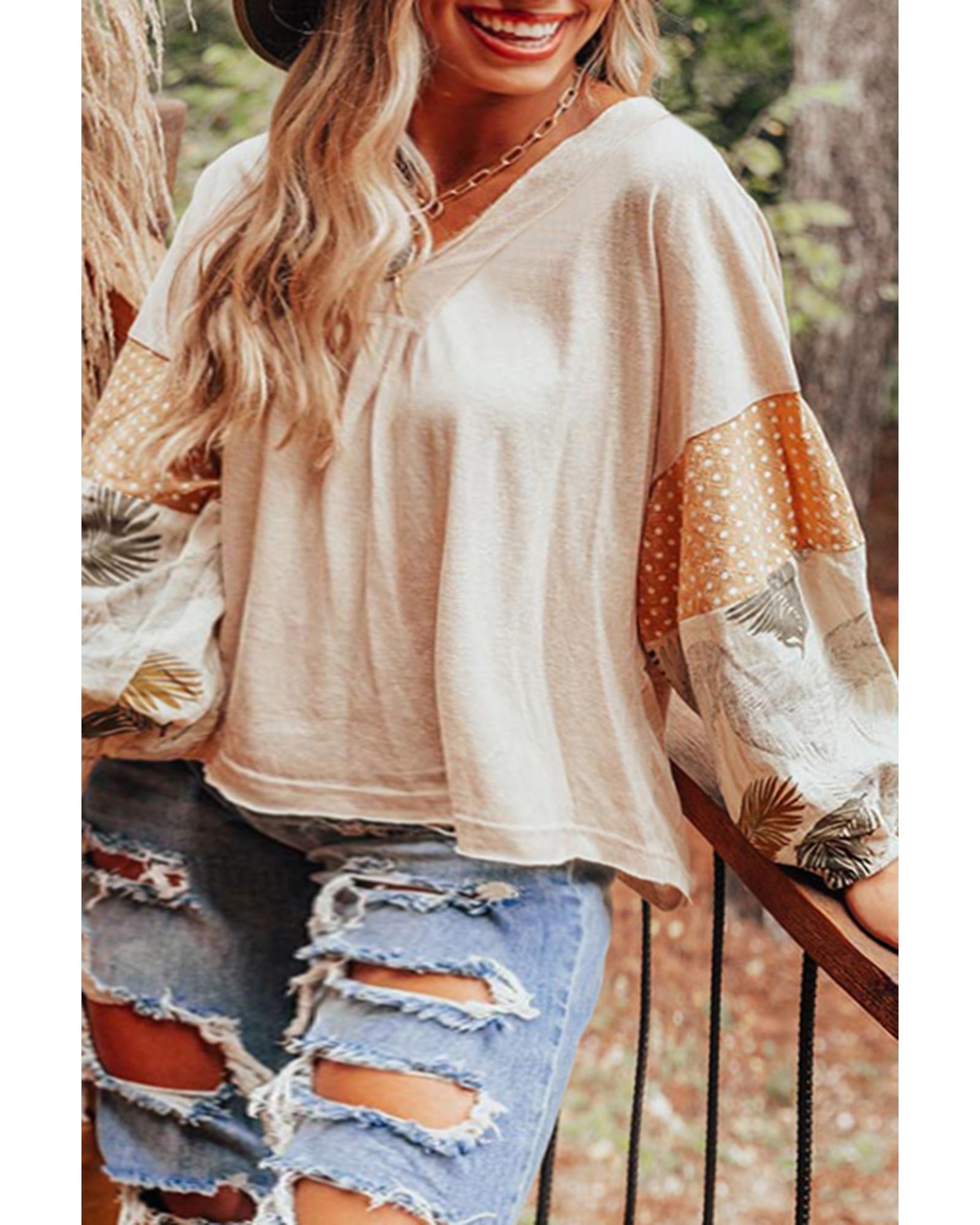 Jet Stream Palm Leaves Polka Dot Puff Sleeve Patchwork V Neck Loose Blouse – L