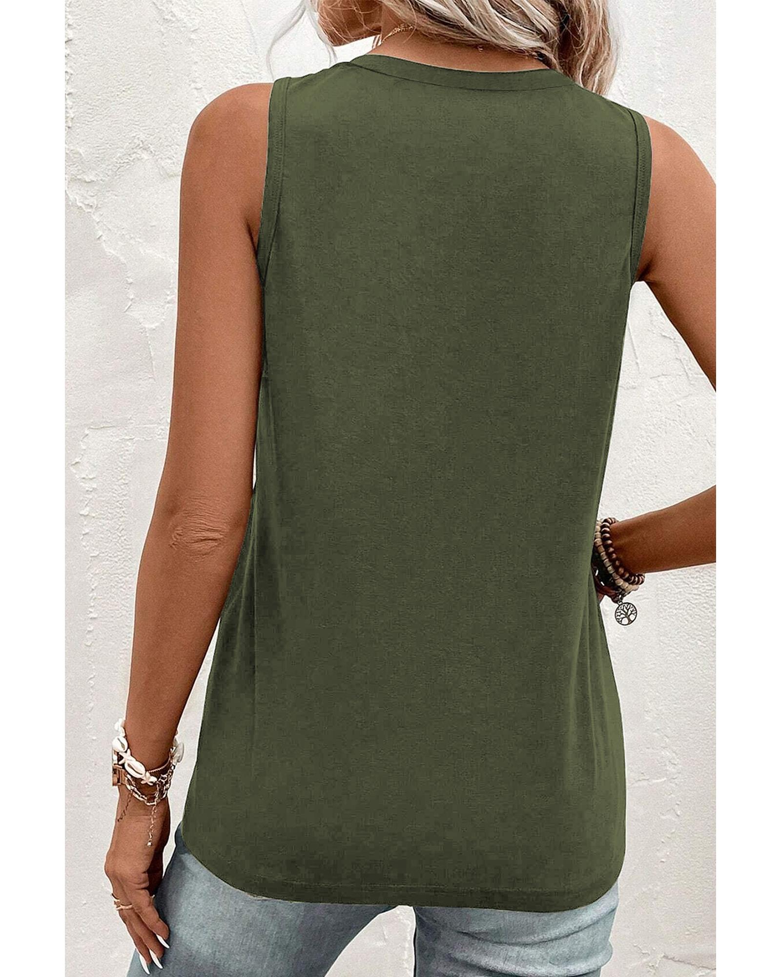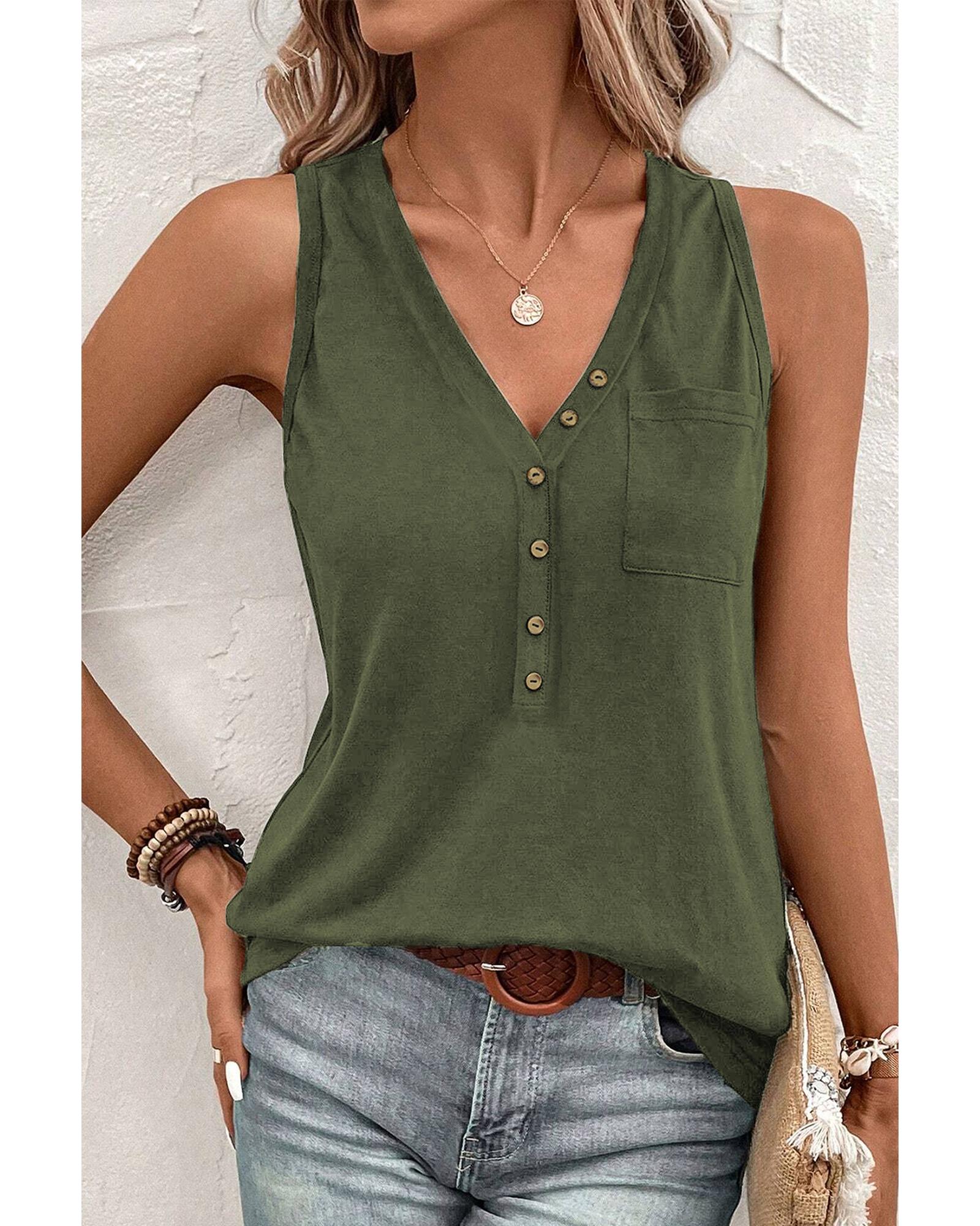 Jungle Green Half Button V Neck Patched Pocket Tank Top – XL