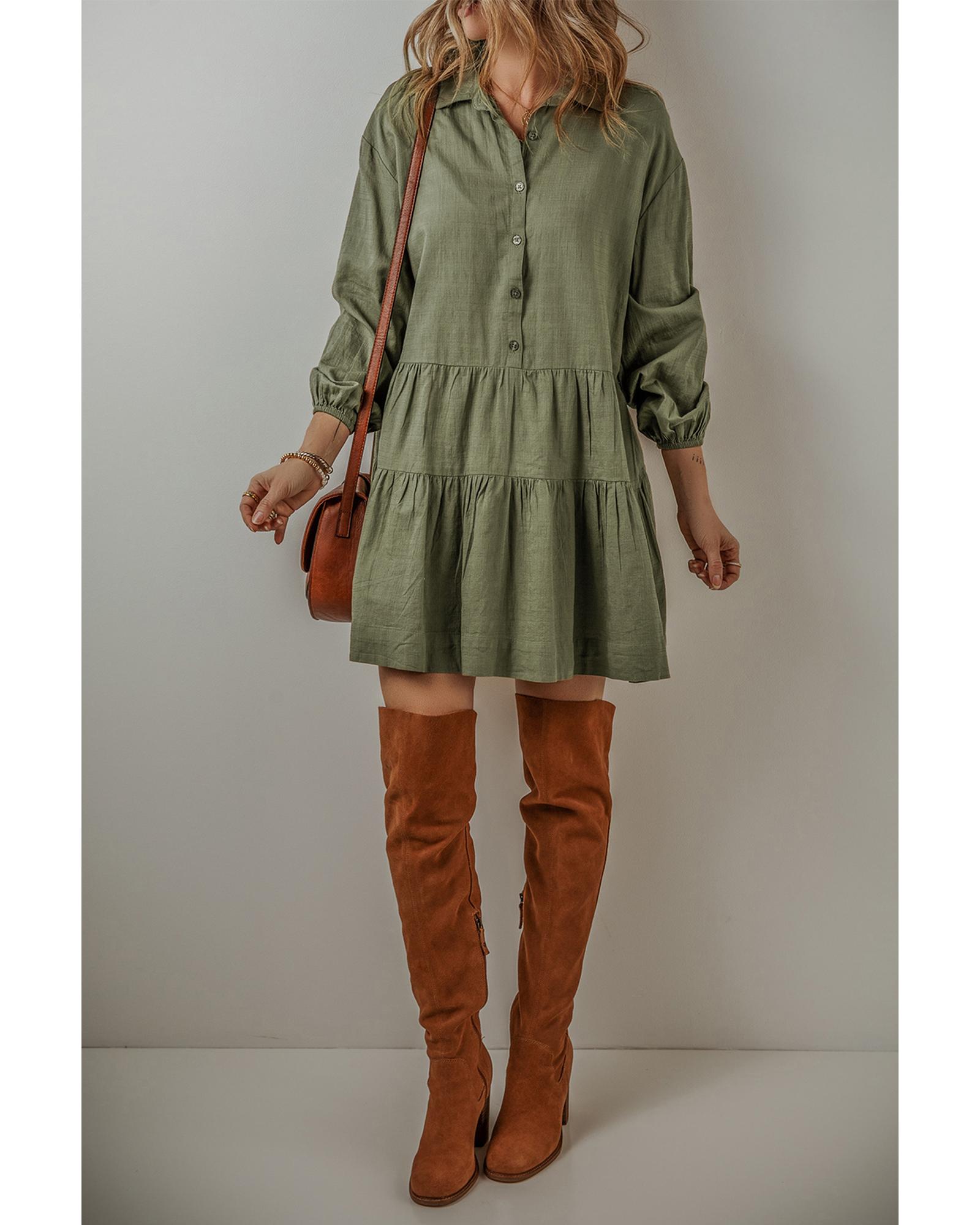 Jungle Green Puff Sleeve Buttoned Tiered Pleated Shirt Mini Dress – M