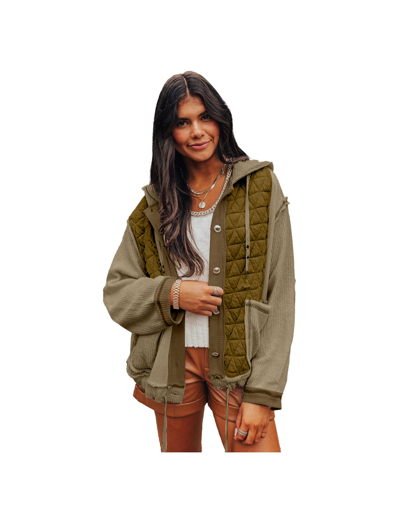 - Jungle Green Quilted Textured Patchwork Loose Fit Hooded Jacket