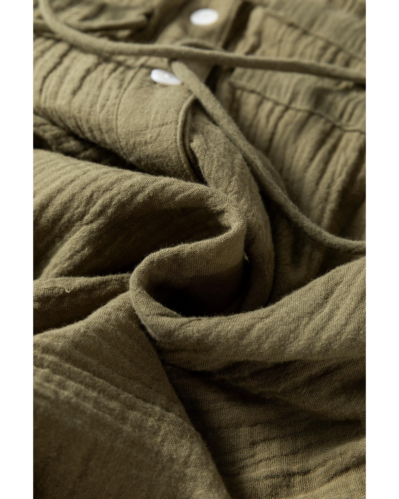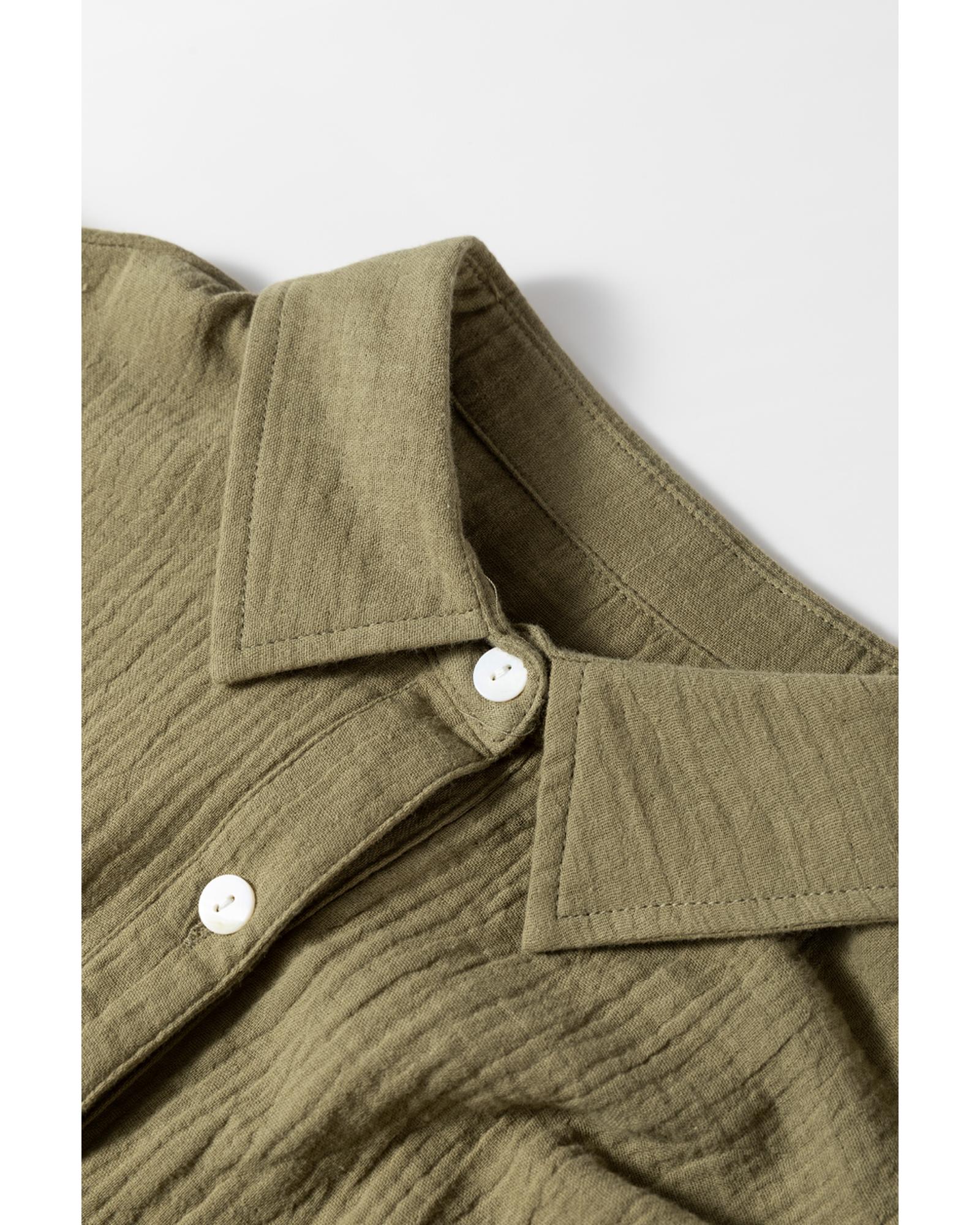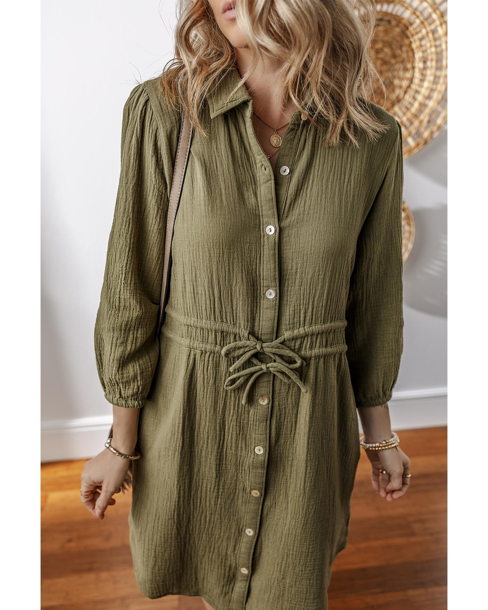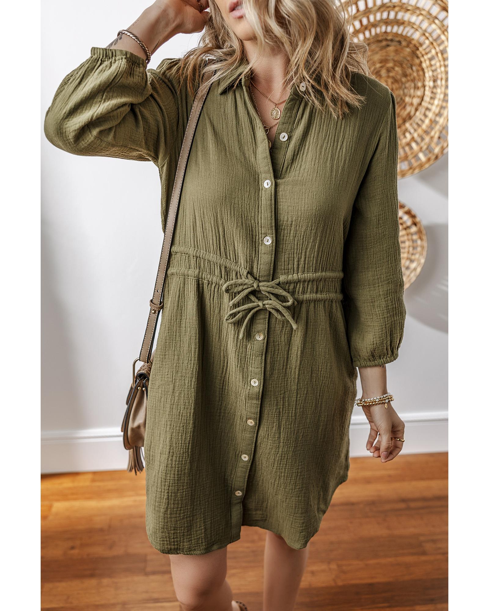 Jungle Green Textured Bracelet Sleeve Collared Button Up Dual Tied Mini Dress – XL