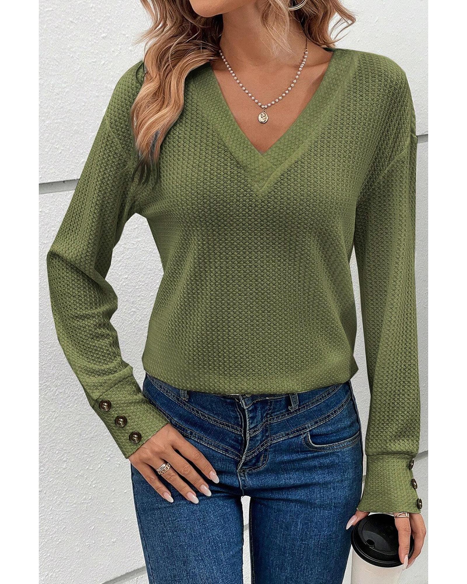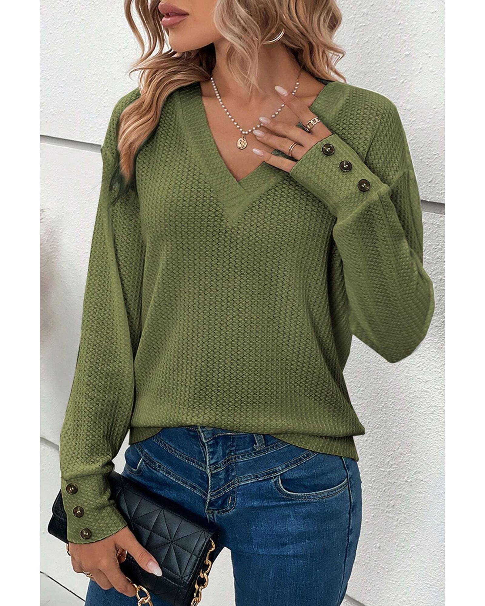 Jungle Green Textured Knit V Neck Button Cuffs Long Sleeve Top – XL