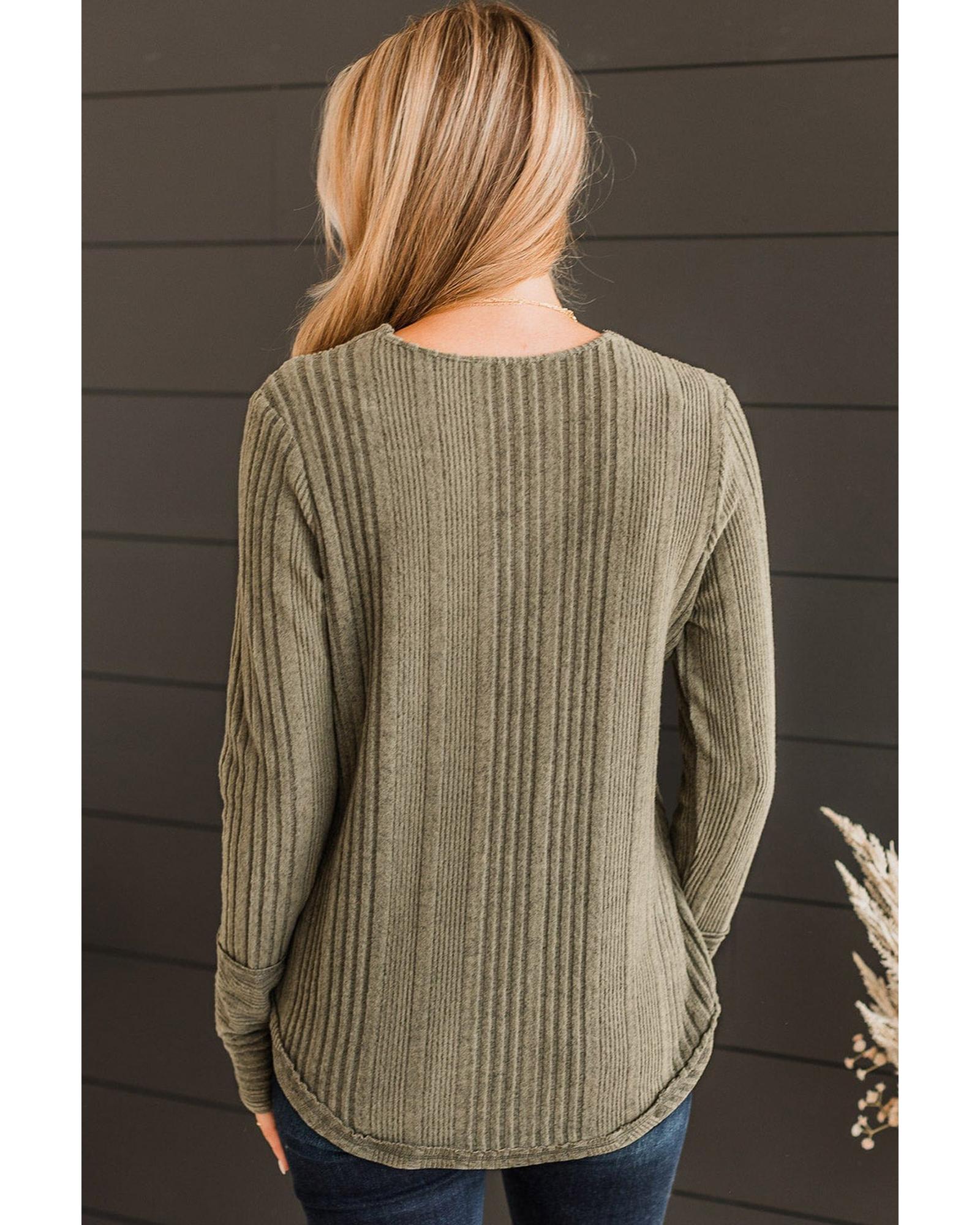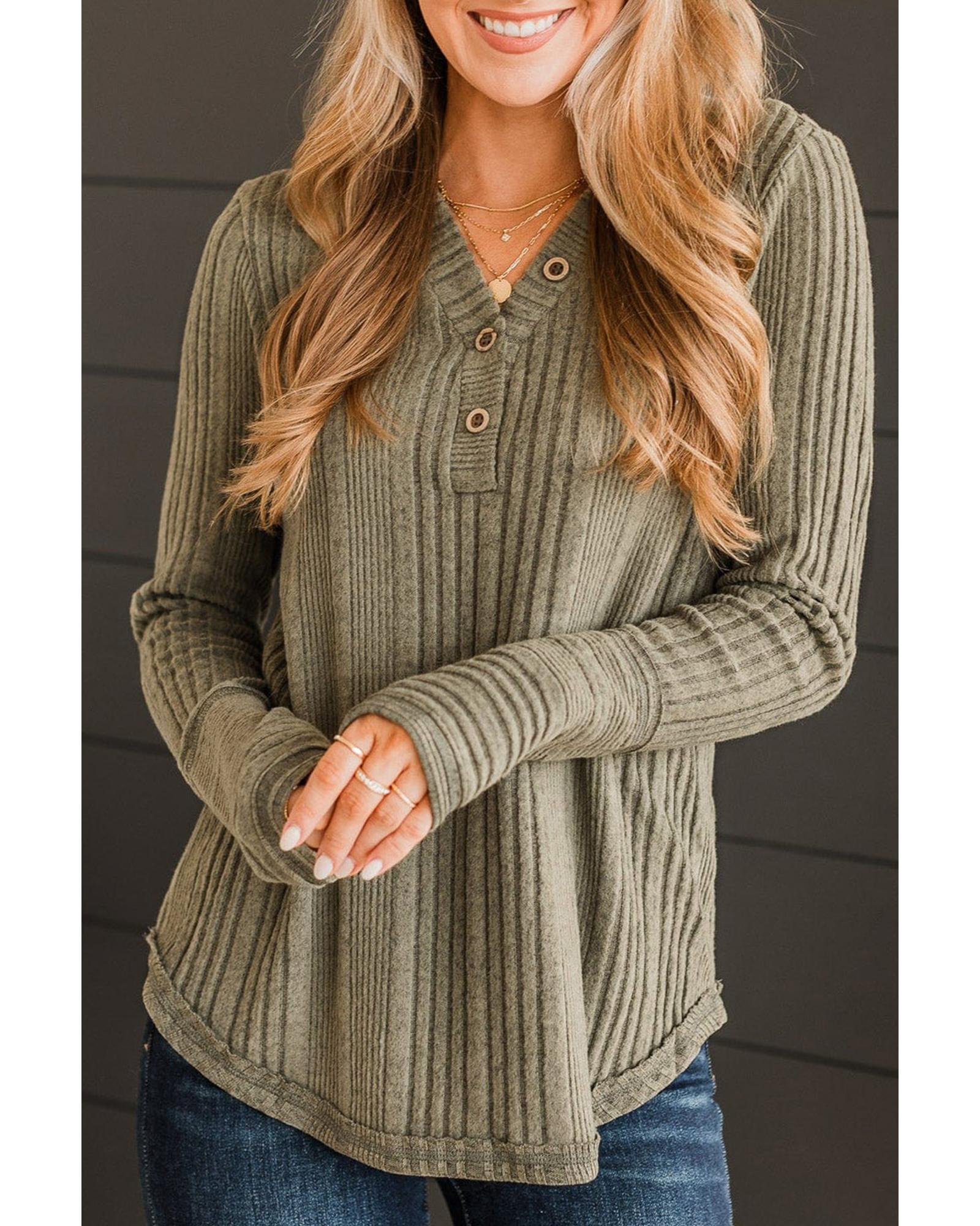 Jungle Green V Neck Buttoned Ribbed Knit Top – L