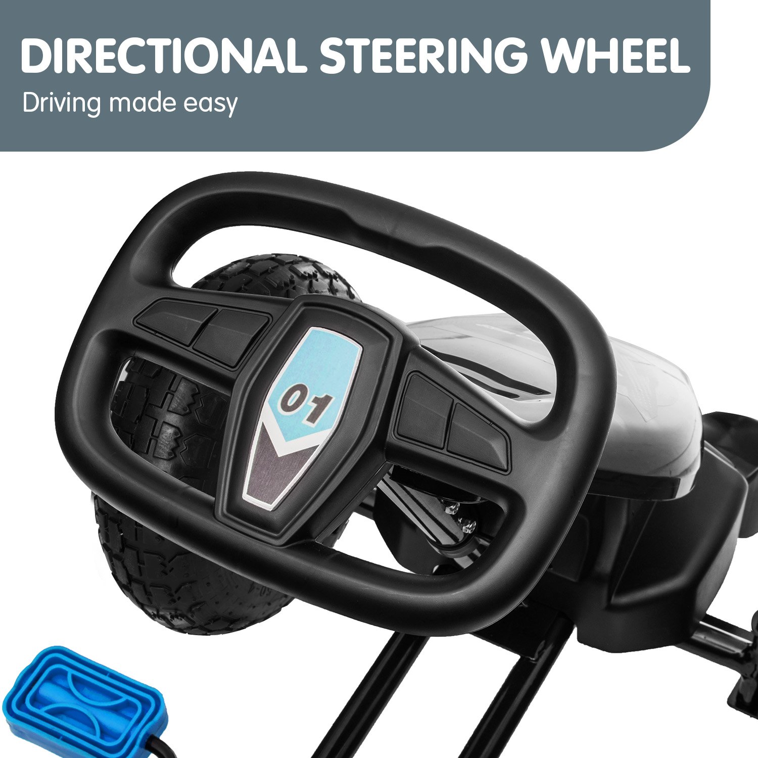 With treaded rubber tyres, a responsive brake system and a directional steering wheel, this go-kart is made with absolute safety in mind. It also has a push/pedal system to switch to manual pushing if needed. Whether your child likes to race or simply cruise the streets with friends, this bag of fun on four wheels will provide hours of go-karting fun!