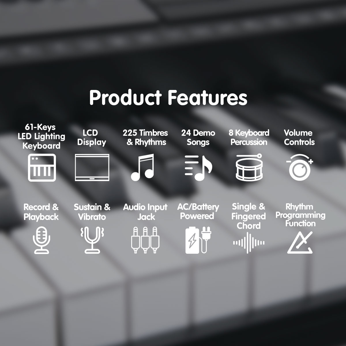 Whether you are a beginner looking for the ideal first keyboard, or an intermediate user seeking to sharpen your skill set, this 61-key electronic piano keyboard provides the perfect combination of professional-grade features and user-friendly design.