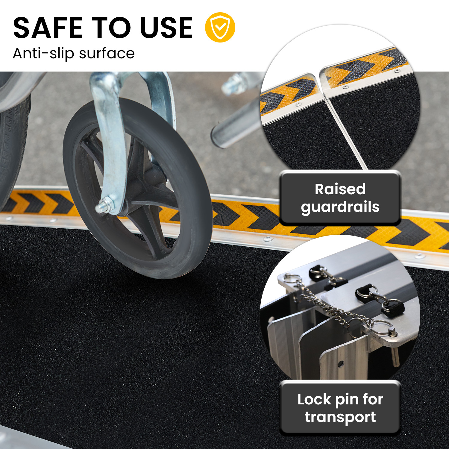 Unfold the path to accessibility with the Kartrite 8ft Aluminium Wheelchair Ramp. This portable ramp is a game-changer, offering strength, stability and safety for wheelchair, rollator and mobility scooter users. With a loading capacity of 275kg and a foldable design, its a versatile solution for various settings, from accessing steps and platforms to entering a vehicle. Whats more, the raised guard rails, anti-slip surface and lock pin mechanism ensure a secure journey every time. Upgrade your mobility with this sturdy and reliable wheelchair ramp.