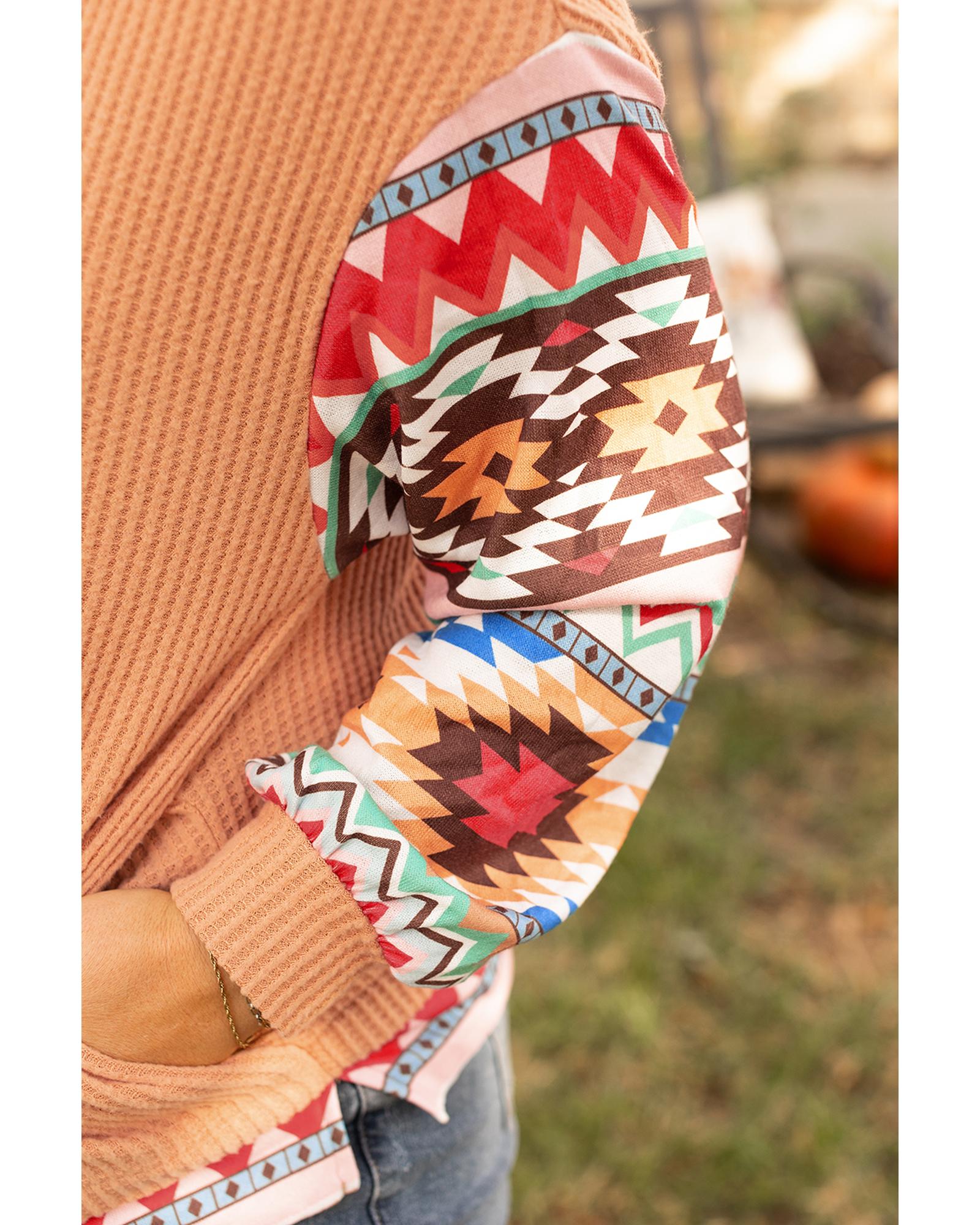 Khaki Aztec Patchwork Waffle Knit Plus Size Hoodie – 1X