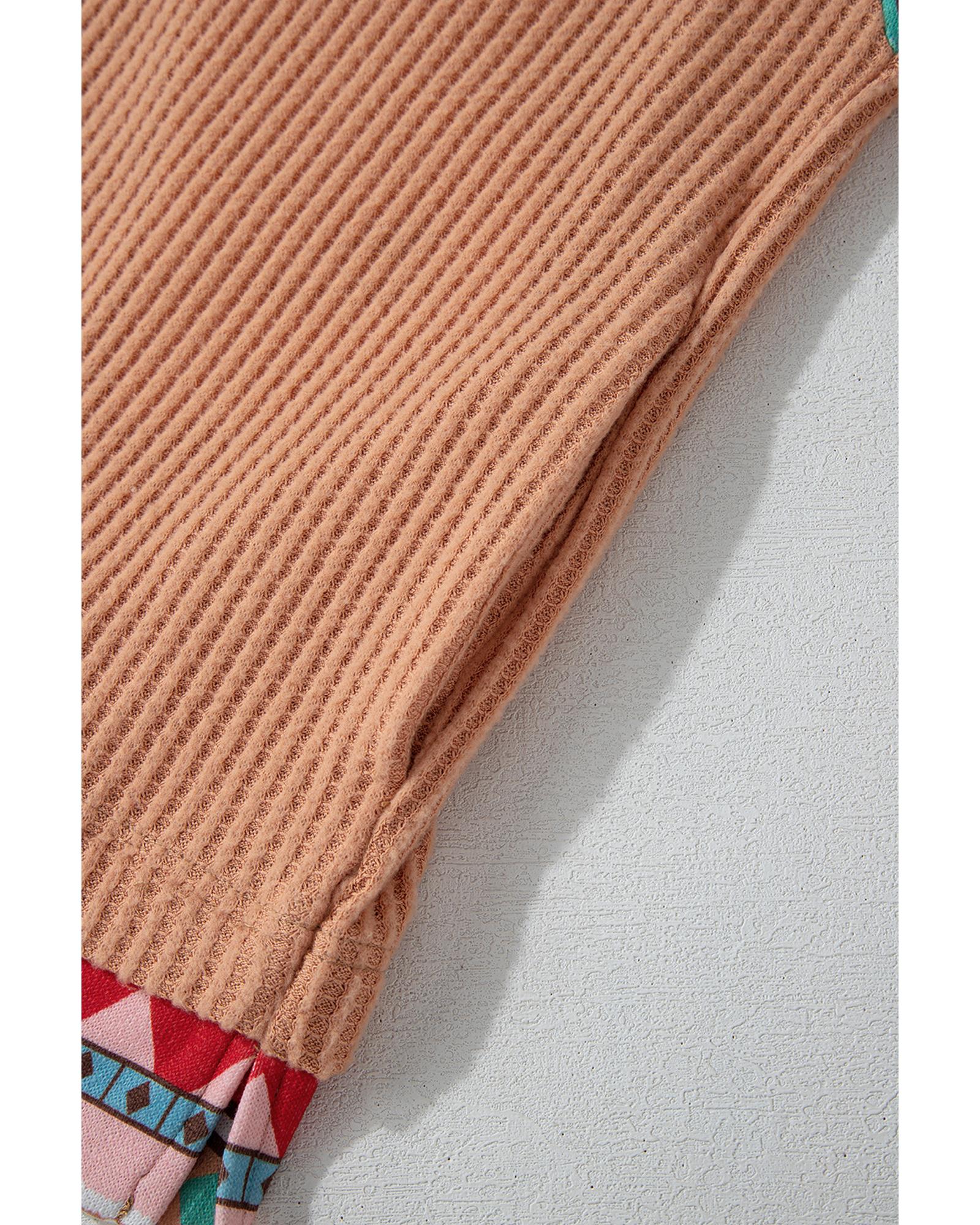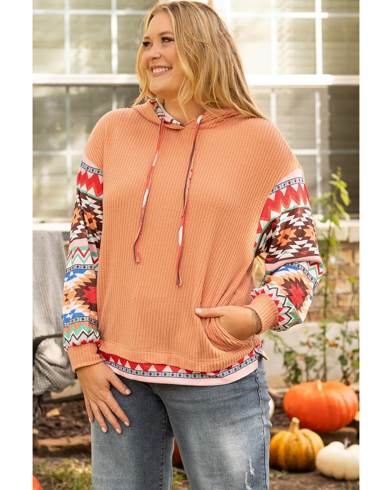 Khaki Aztec Patchwork Waffle Knit Plus Size Hoodie – 3X