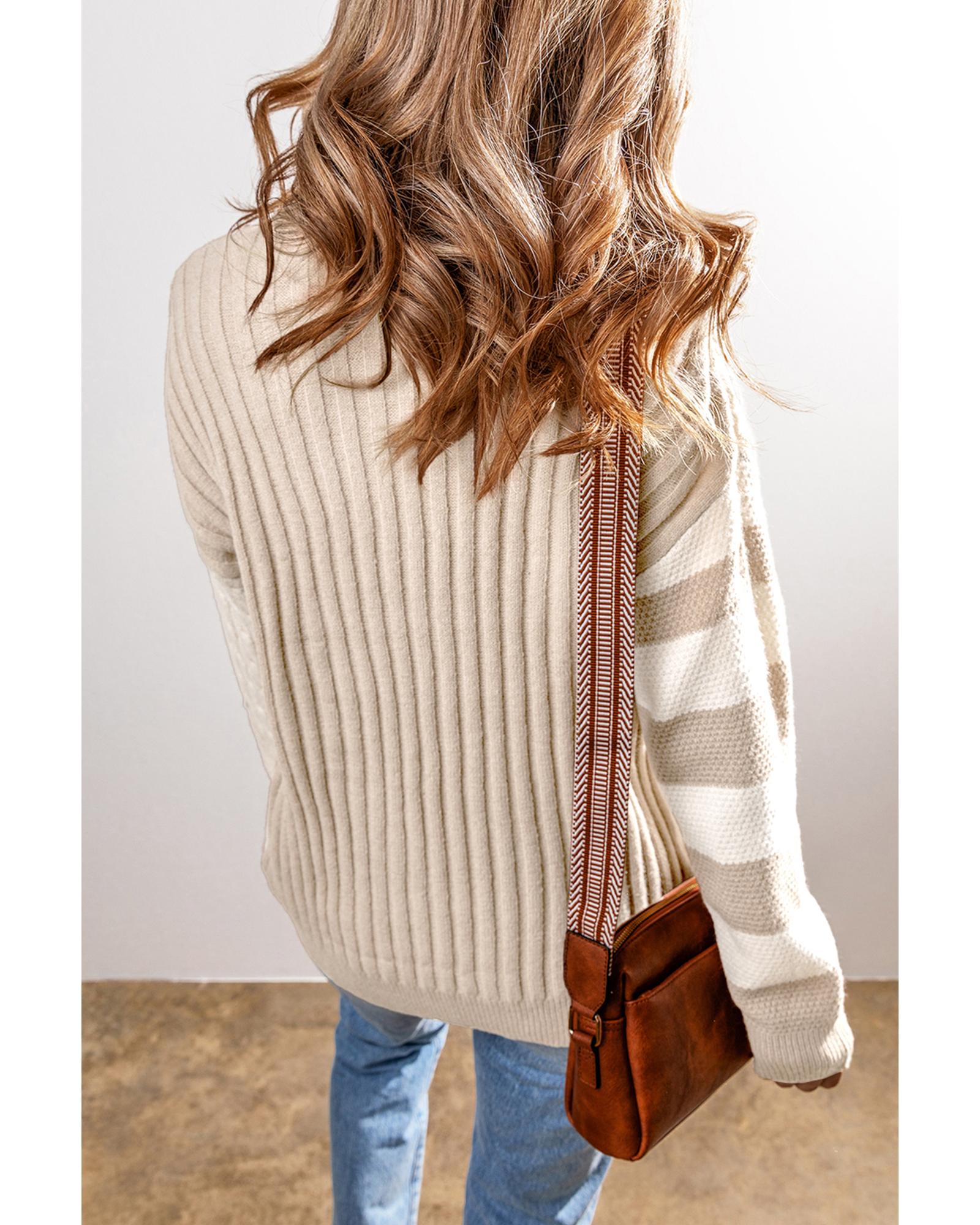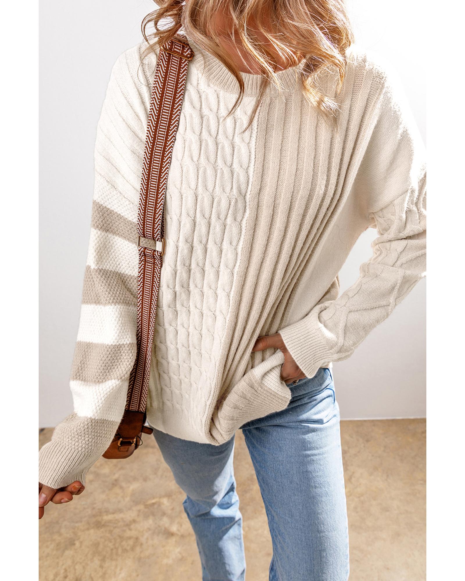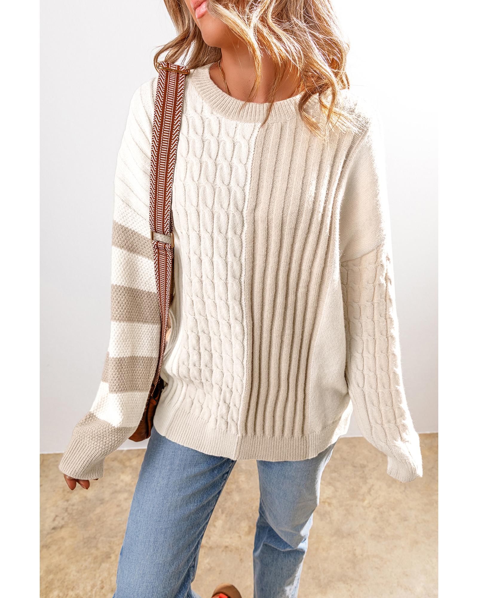 Khaki Cable Knit Colorblock Crew Neck Drop Shoulder Sweater – L