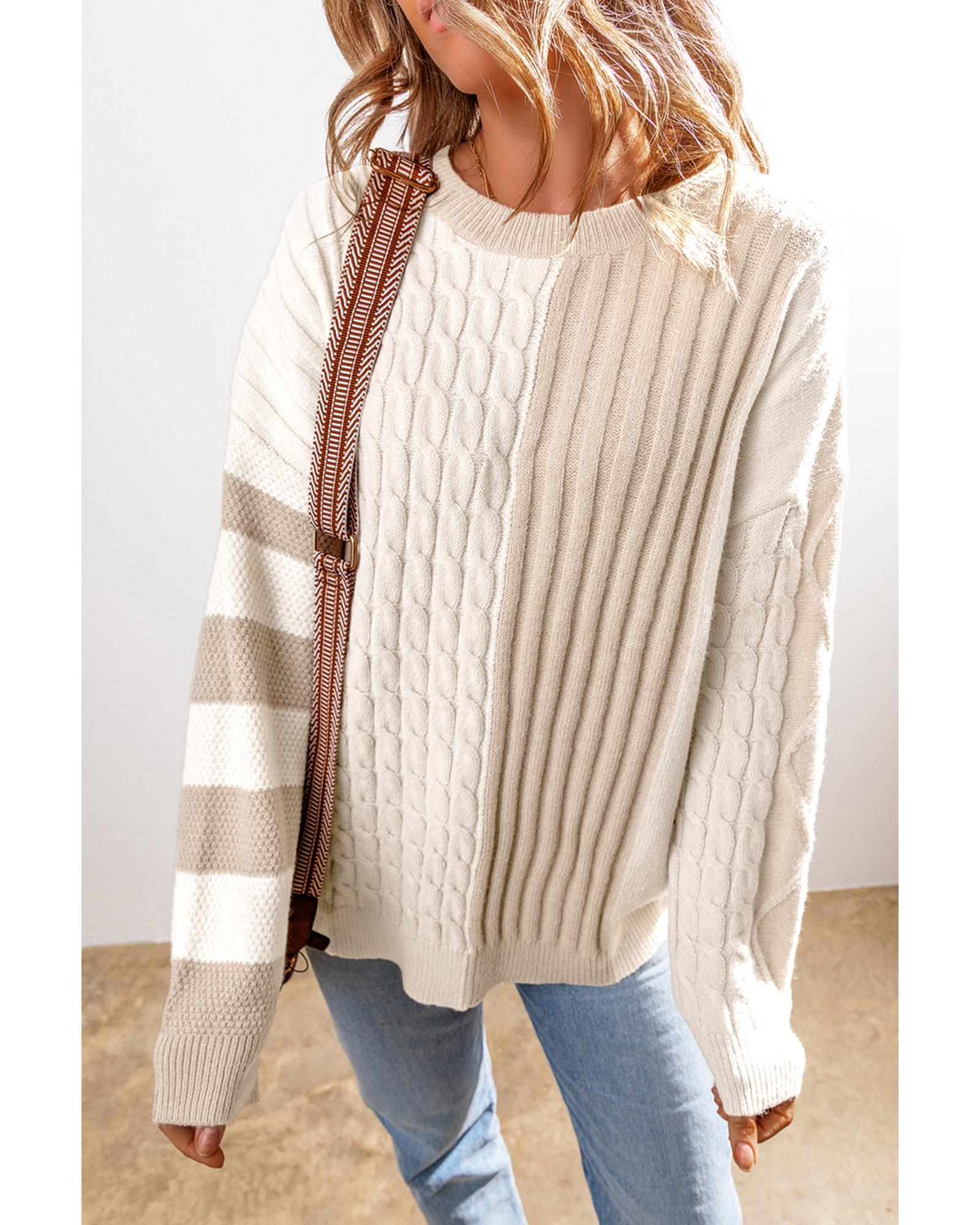 Khaki Cable Knit Colorblock Crew Neck Drop Shoulder Sweater – M