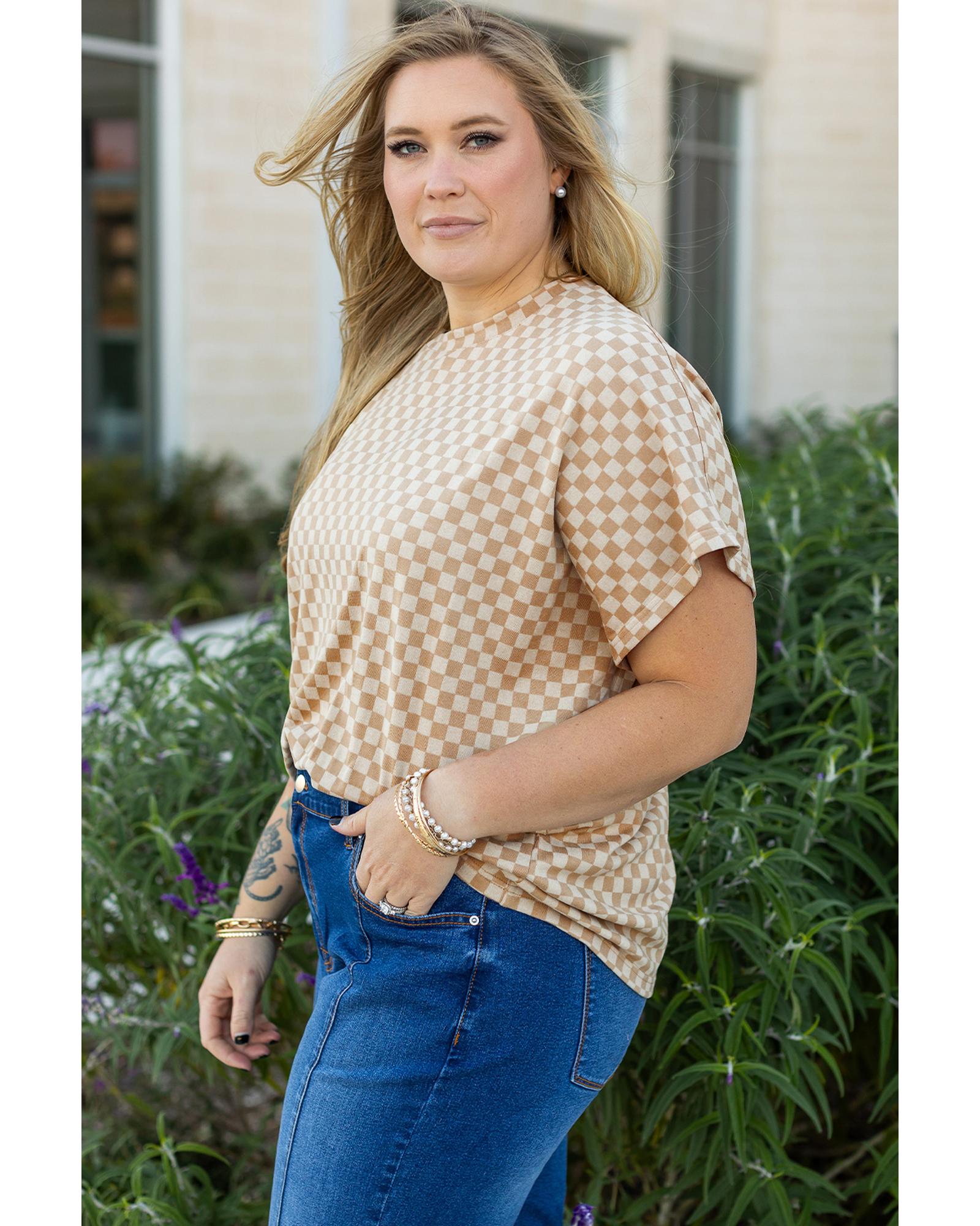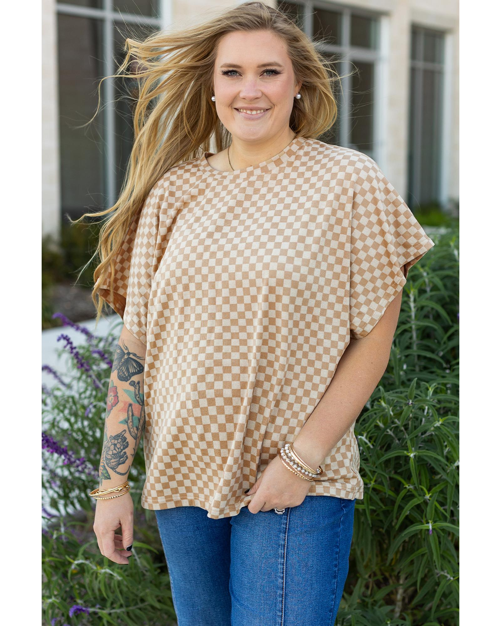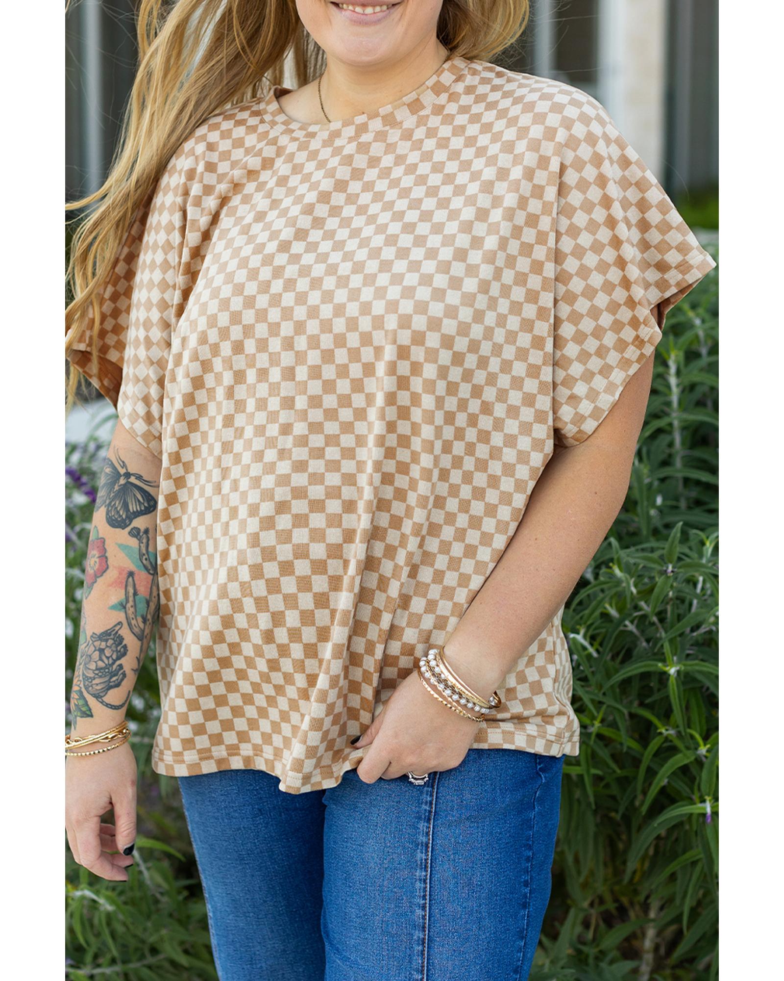Khaki Checkerboard Short Batwing Sleeve Round Neck Plus Size T Shirt – 4X