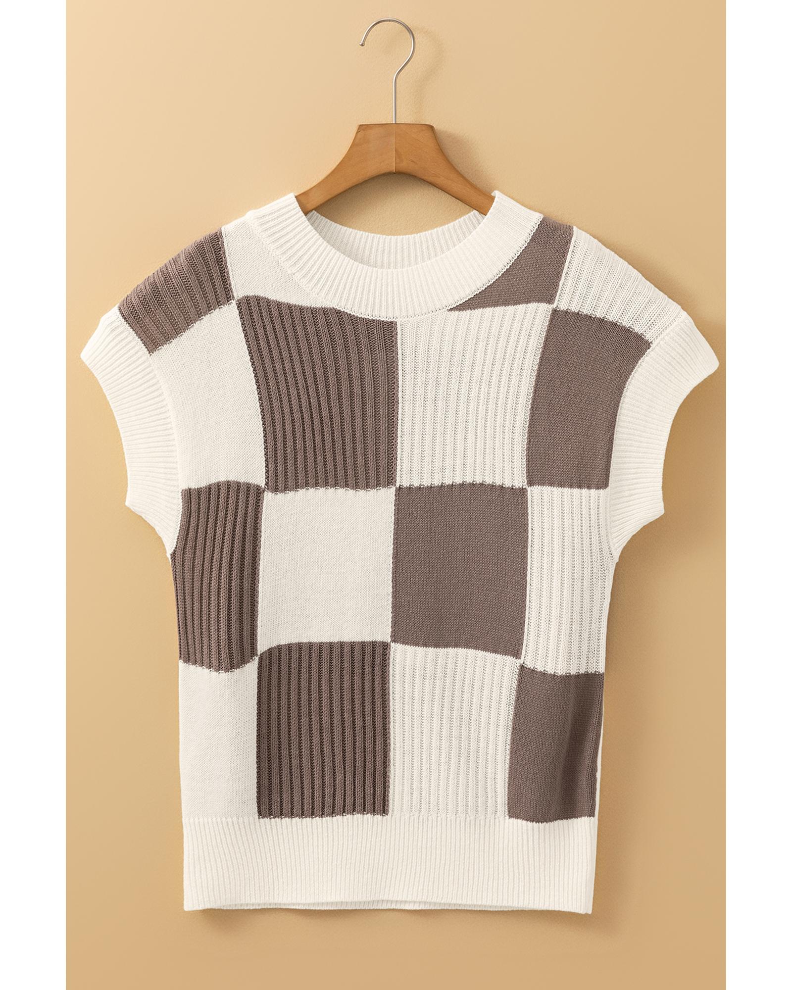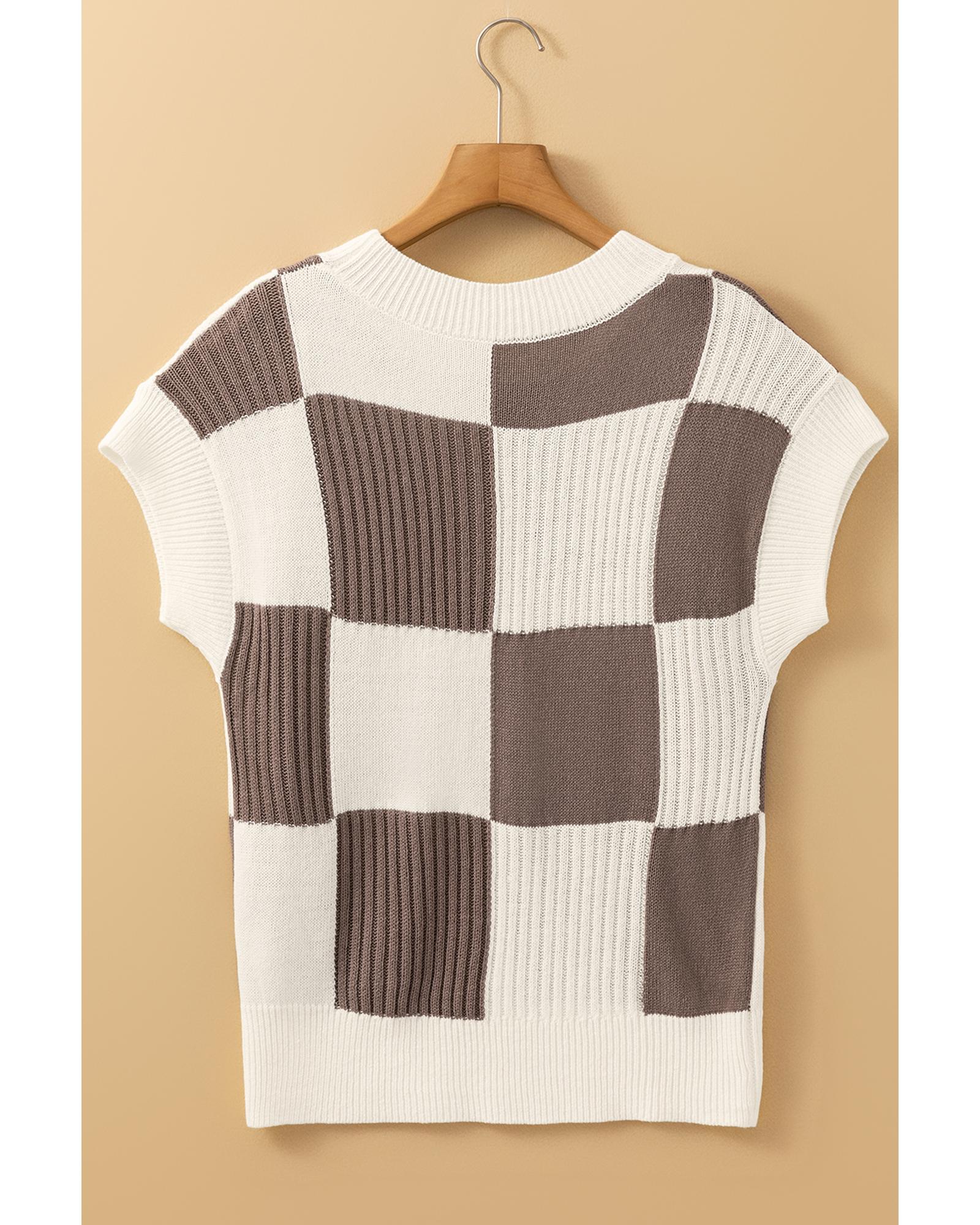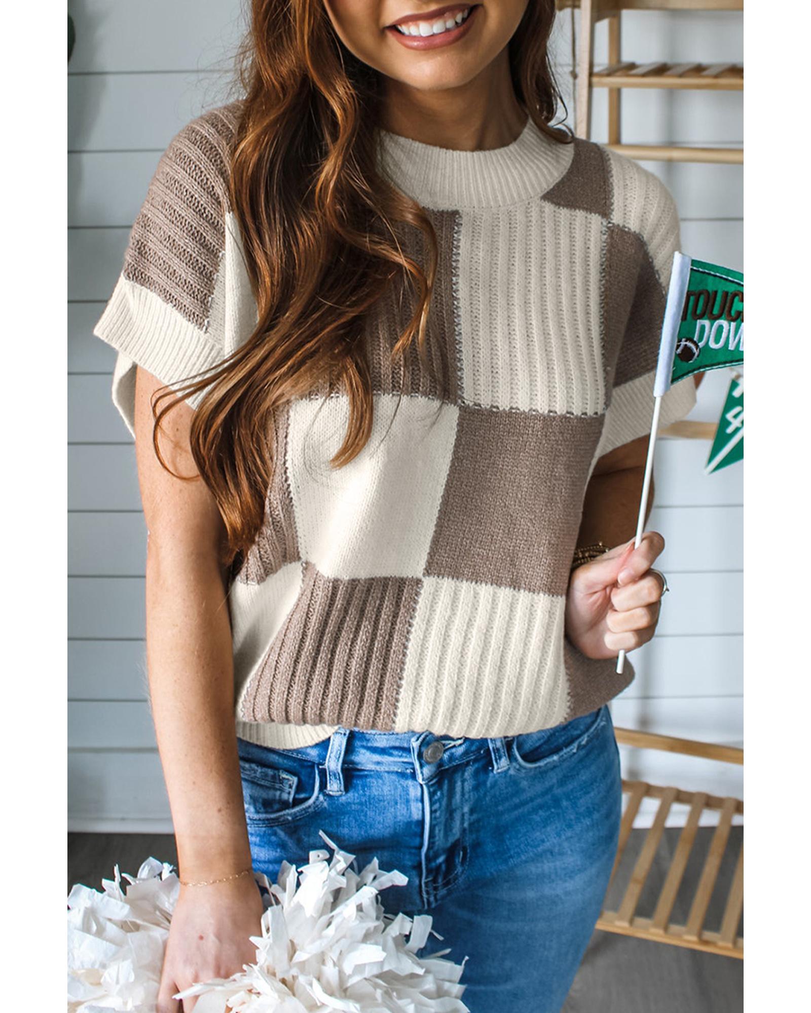 Khaki Checkered Color Block Crew Neck Short Sleeve Sweater – S