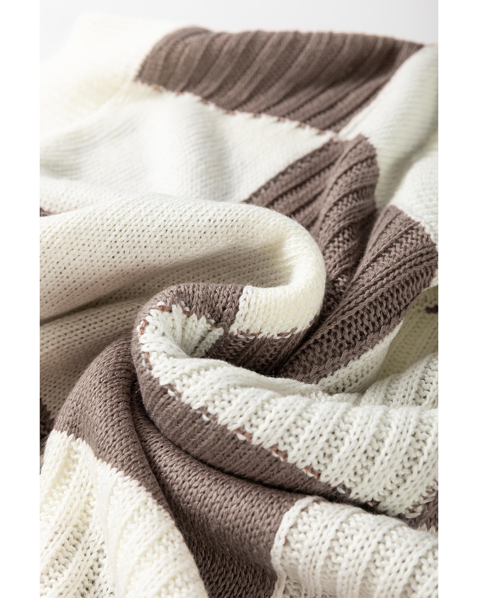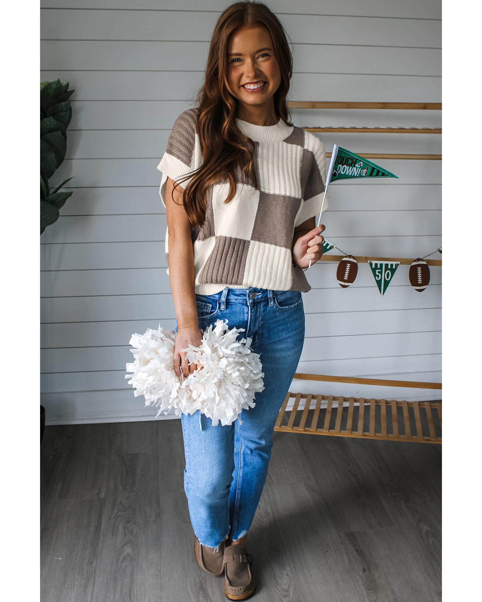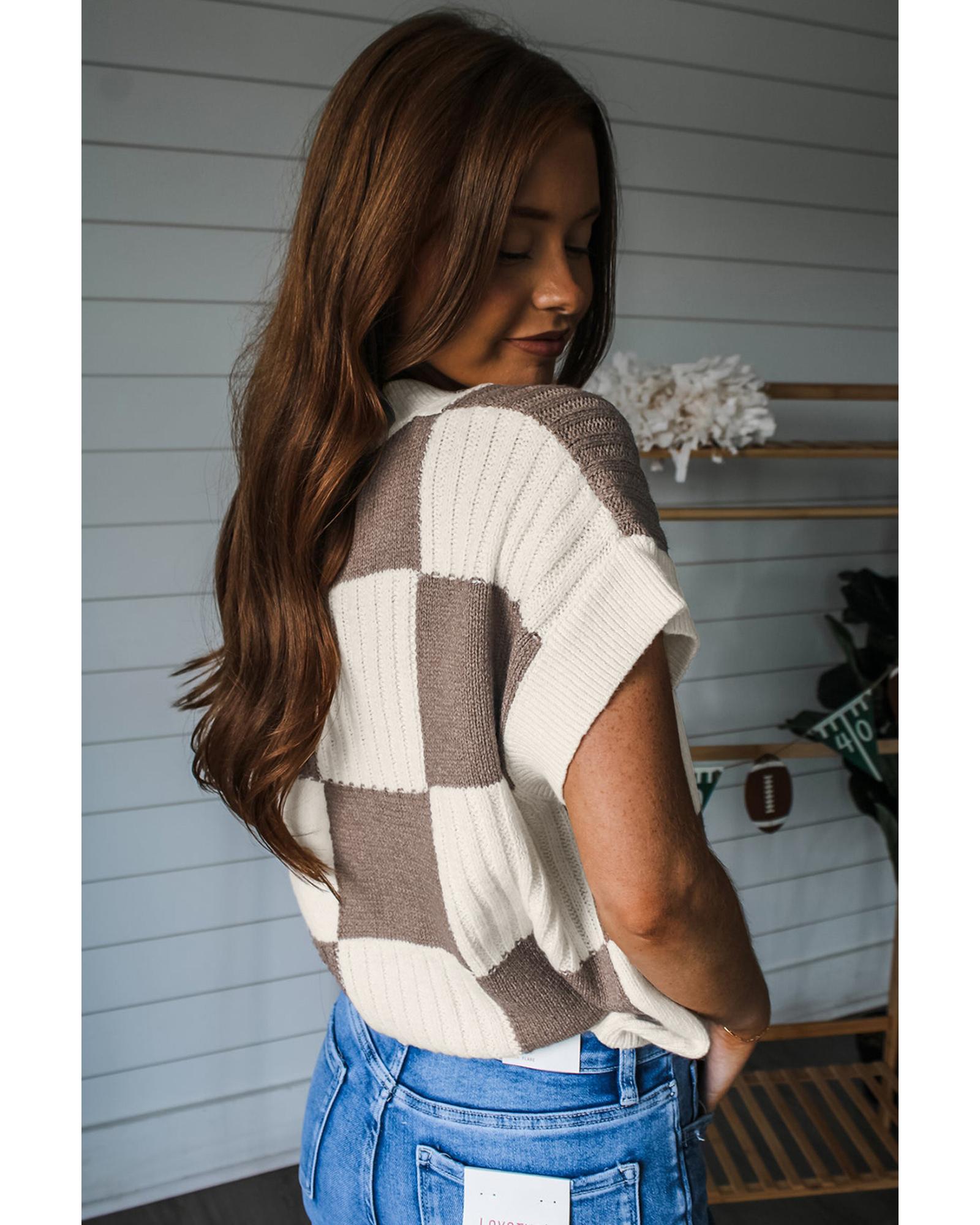 Khaki Checkered Color Block Crew Neck Short Sleeve Sweater – XL