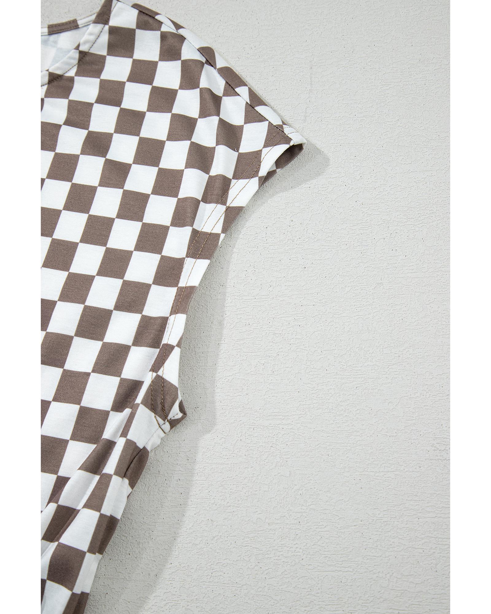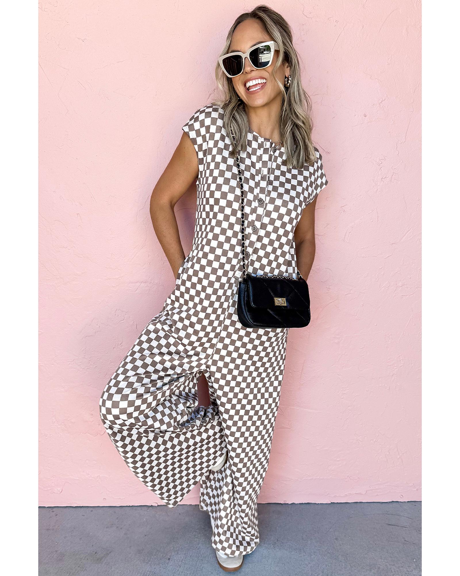 Khaki Checkered Print Buttoned Crew Neck Wide Leg Jumpsuit – L