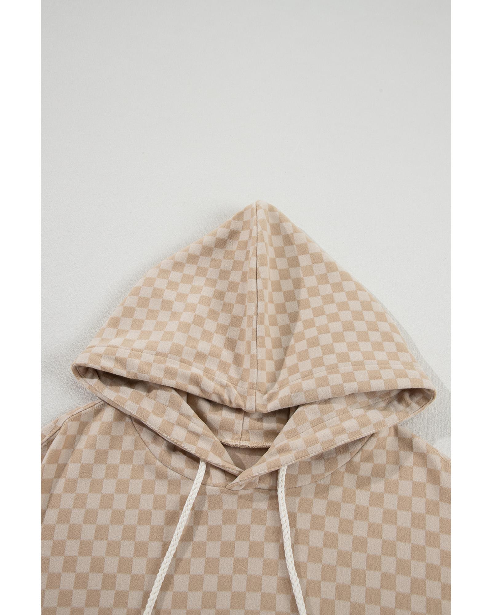 Khaki Checkered Print Kangaroo Pocket Drawstring Hoodie – L
