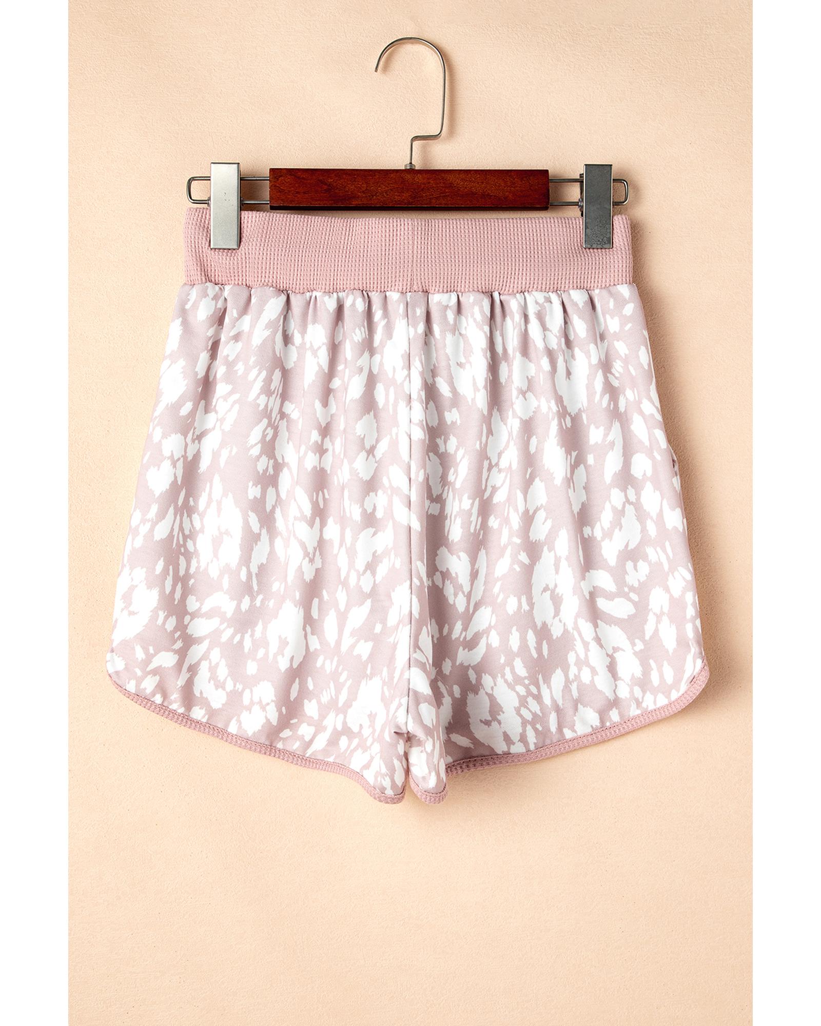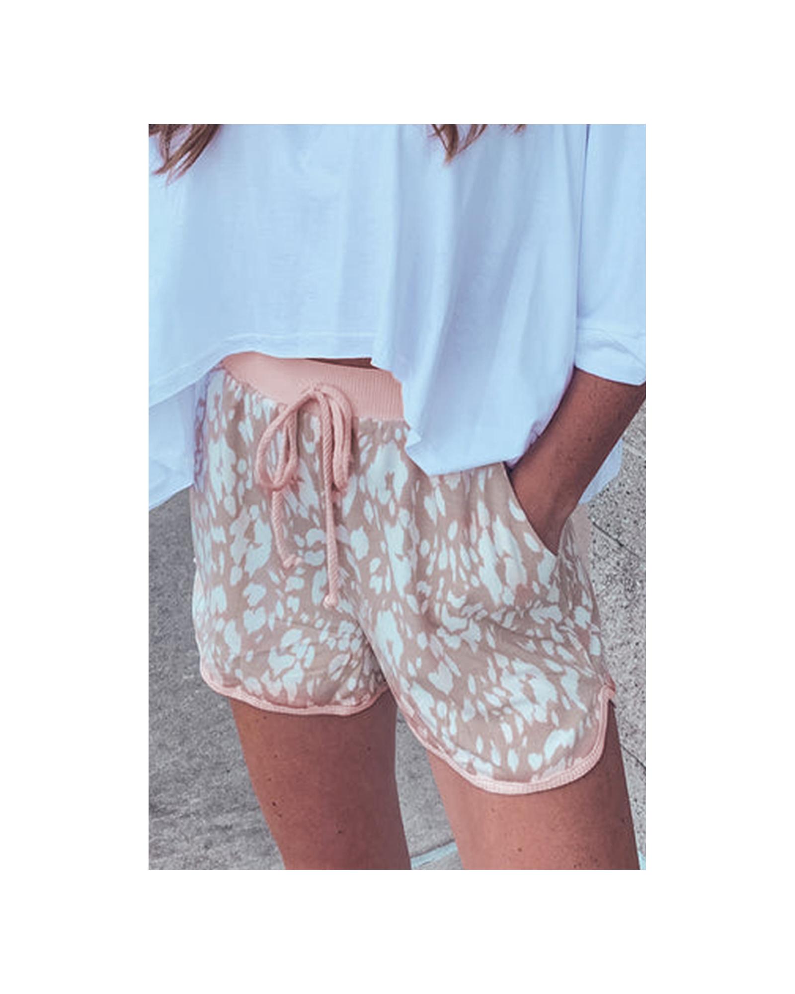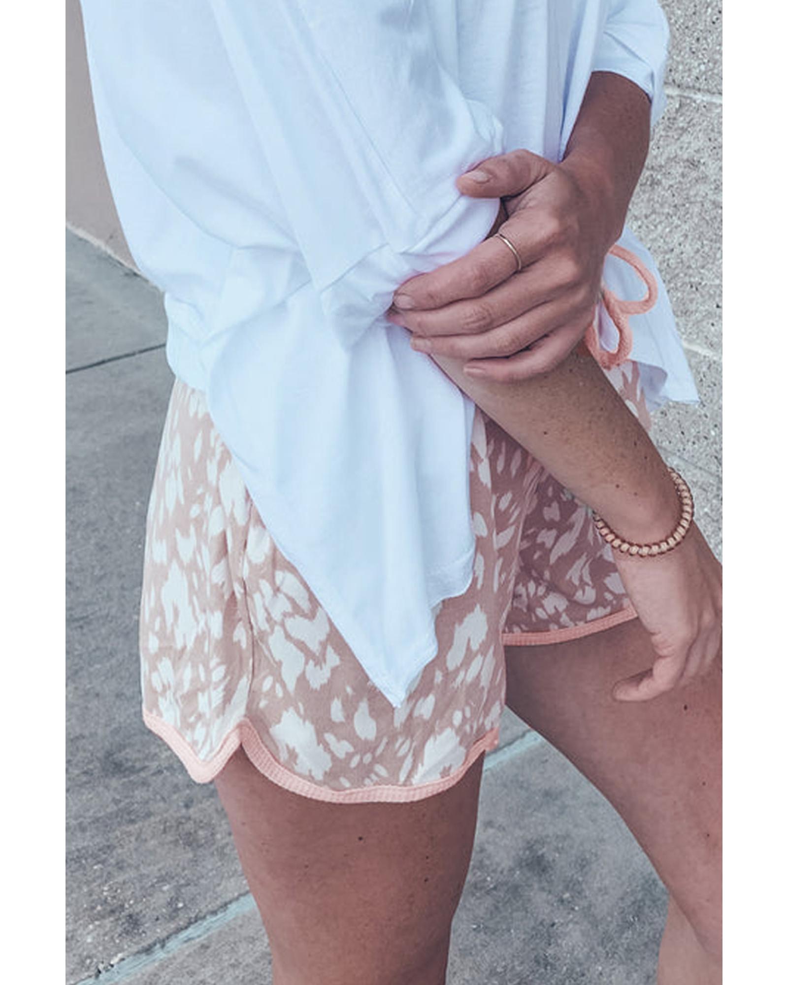 Khaki Classic Leopard Arched Hem Elastic Waist Casual Shorts – M