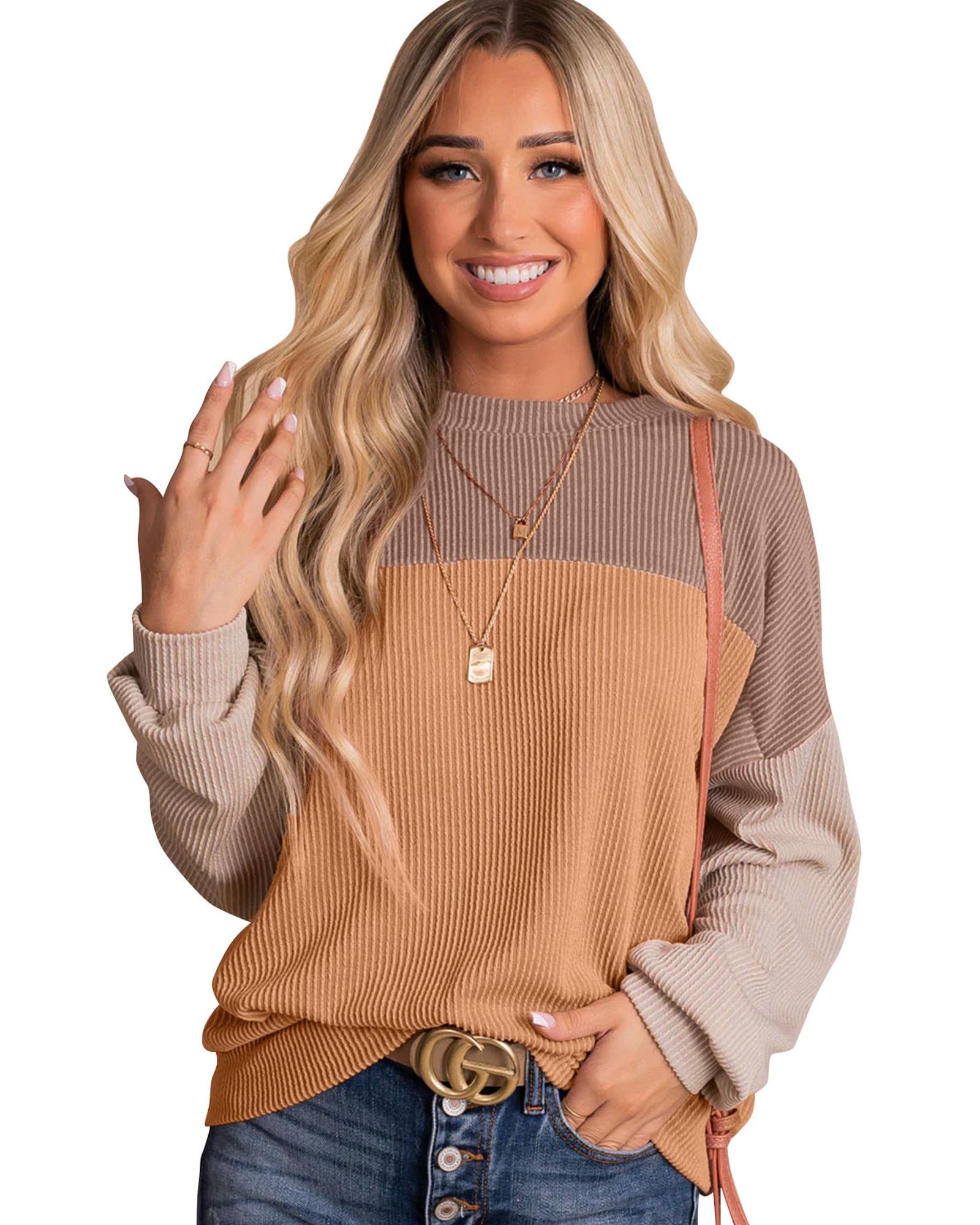 Chic and effortless look Bold and eye - catching color block design Ribbed texture for a comfortable and flattering fit Long sleeves for added coverage Available in various sizes for women