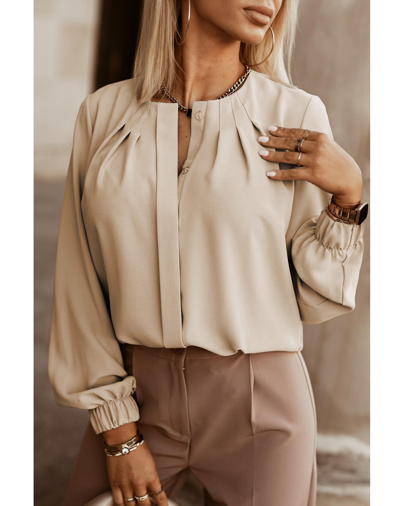 Khaki Crew Neck Gathered Stretch Cuff Shirt – XL