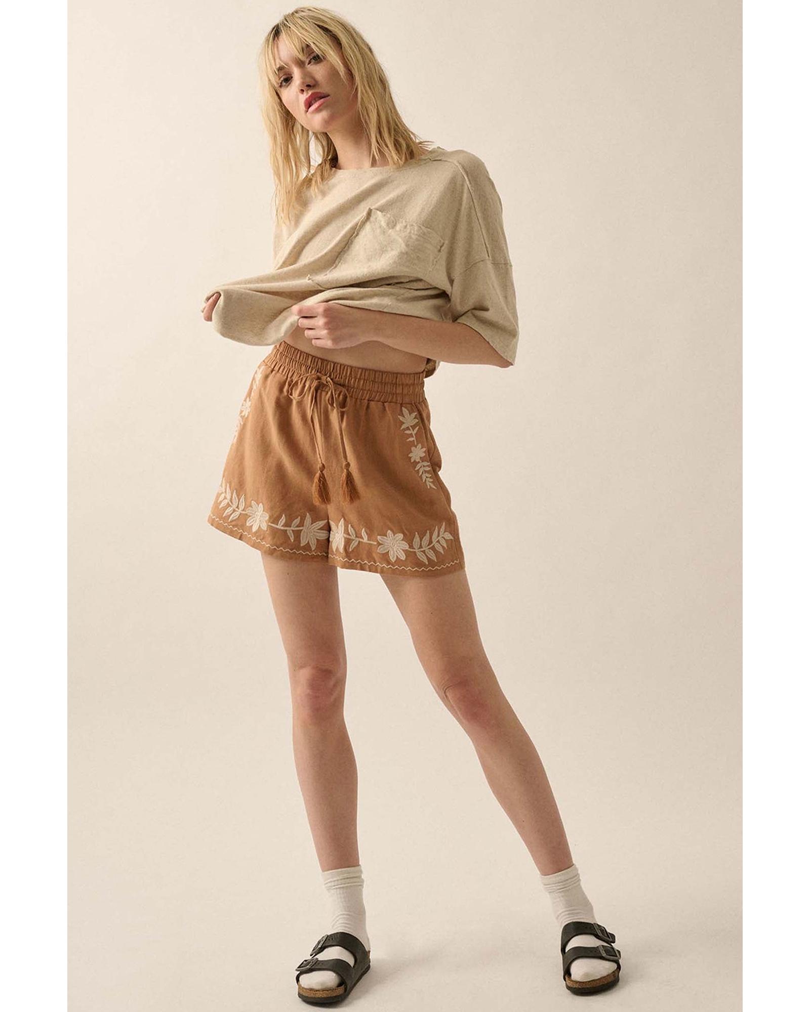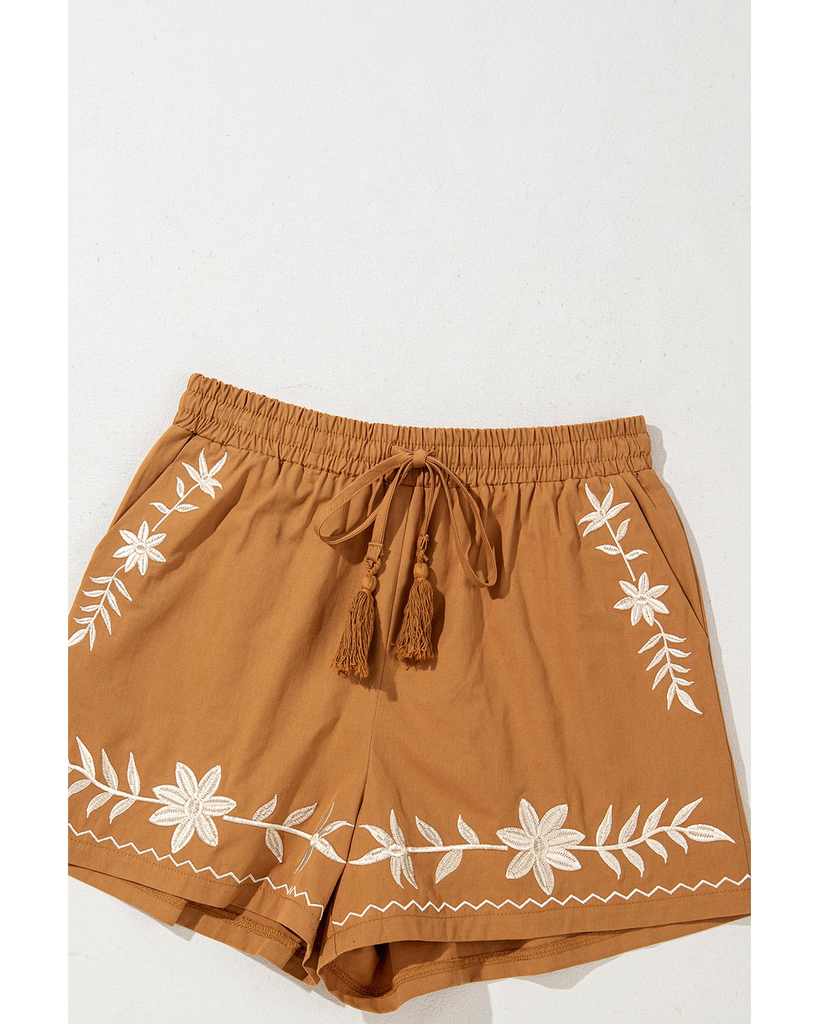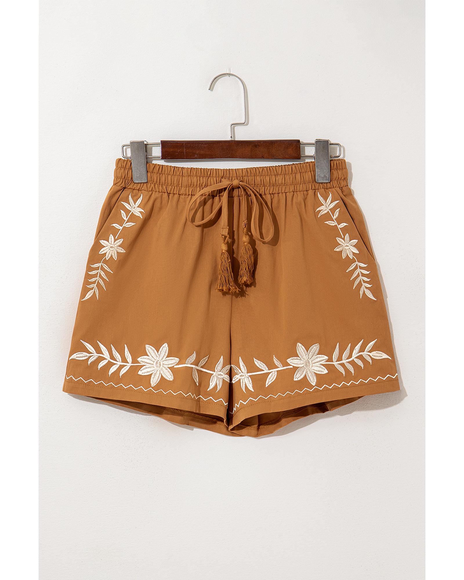 Khaki Embroidered Boho Tasseled Drawstring Elastic Waist Casual shorts – M
