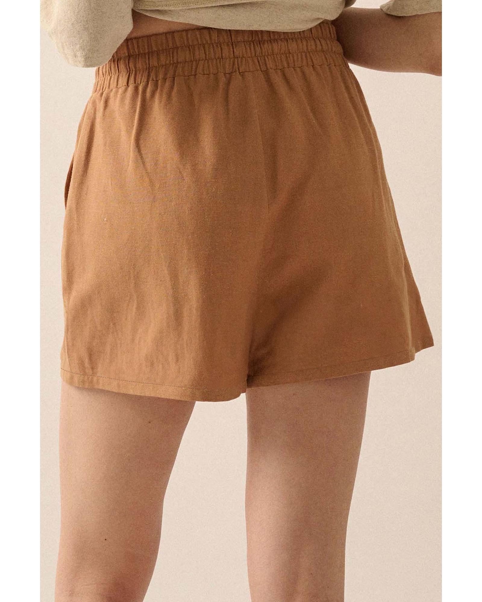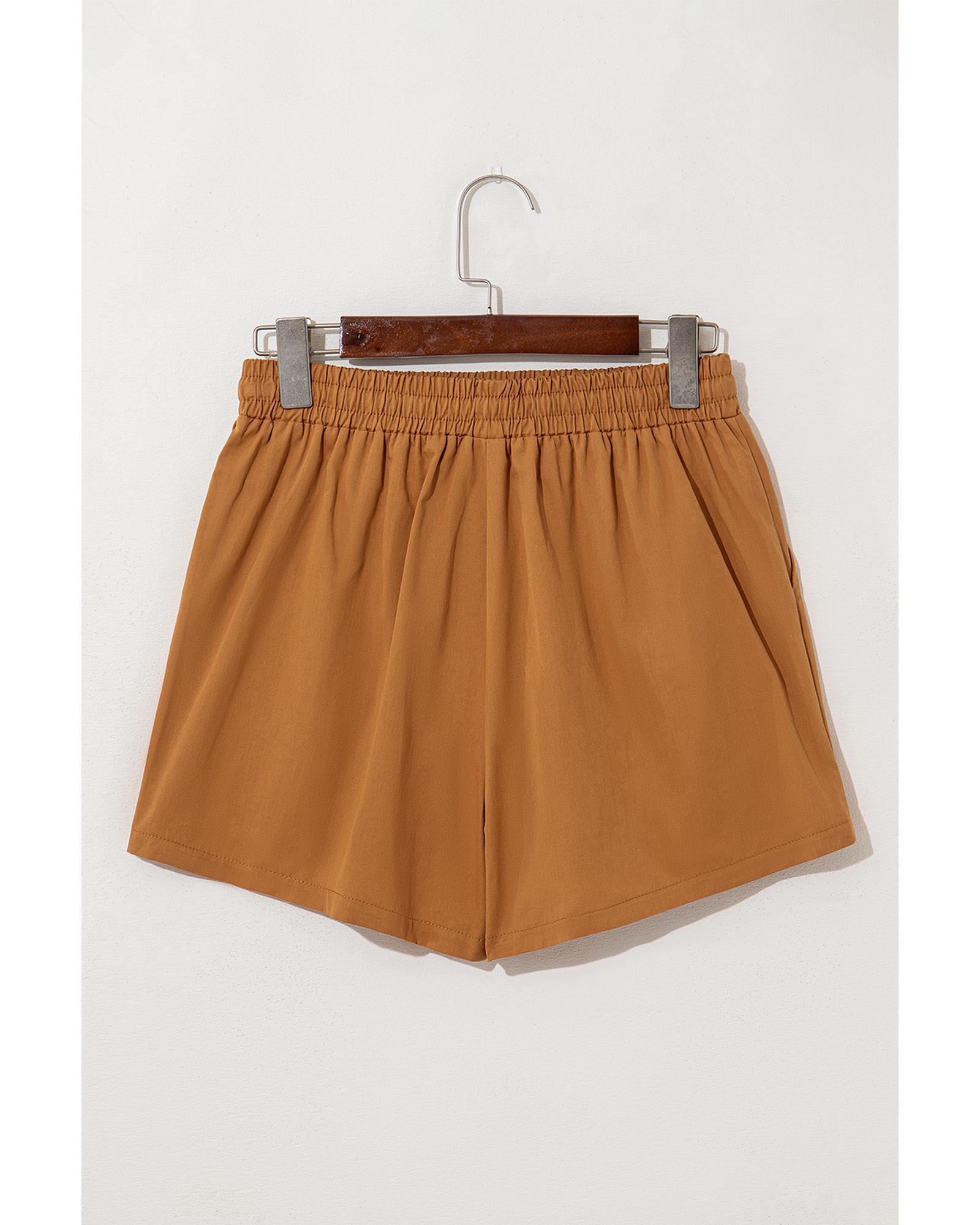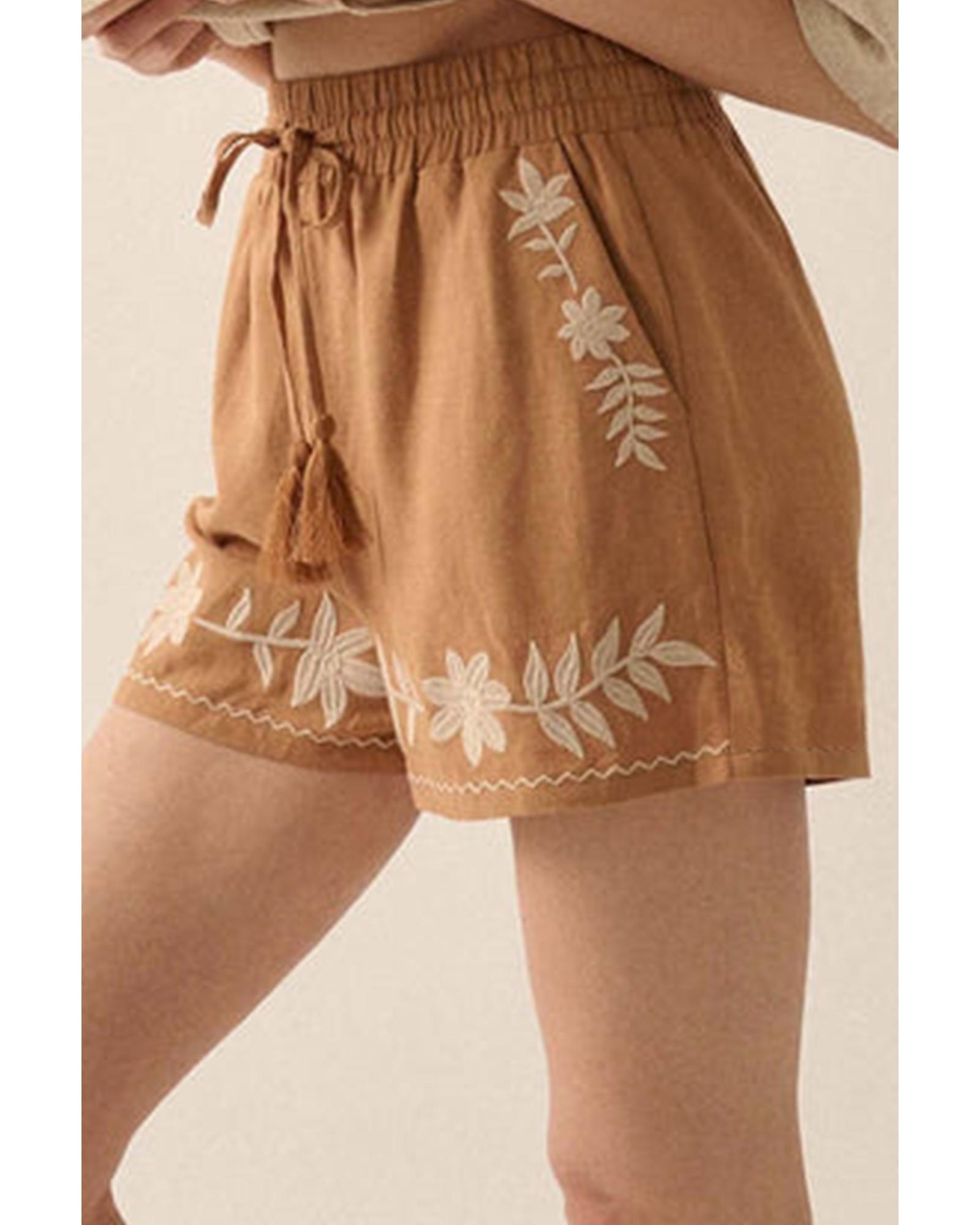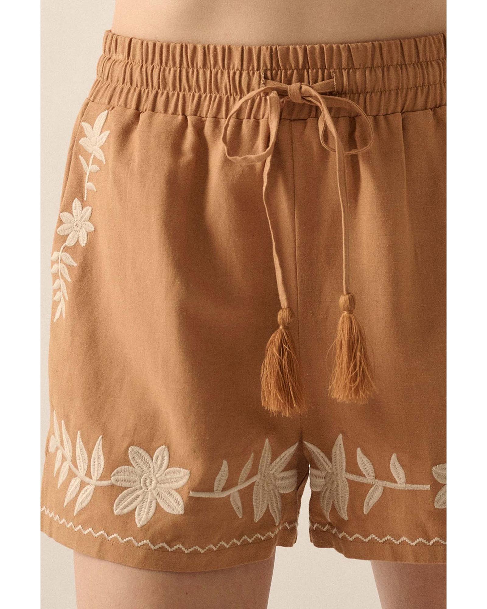 Khaki Embroidered Boho Tasseled Drawstring Elastic Waist Casual shorts – M