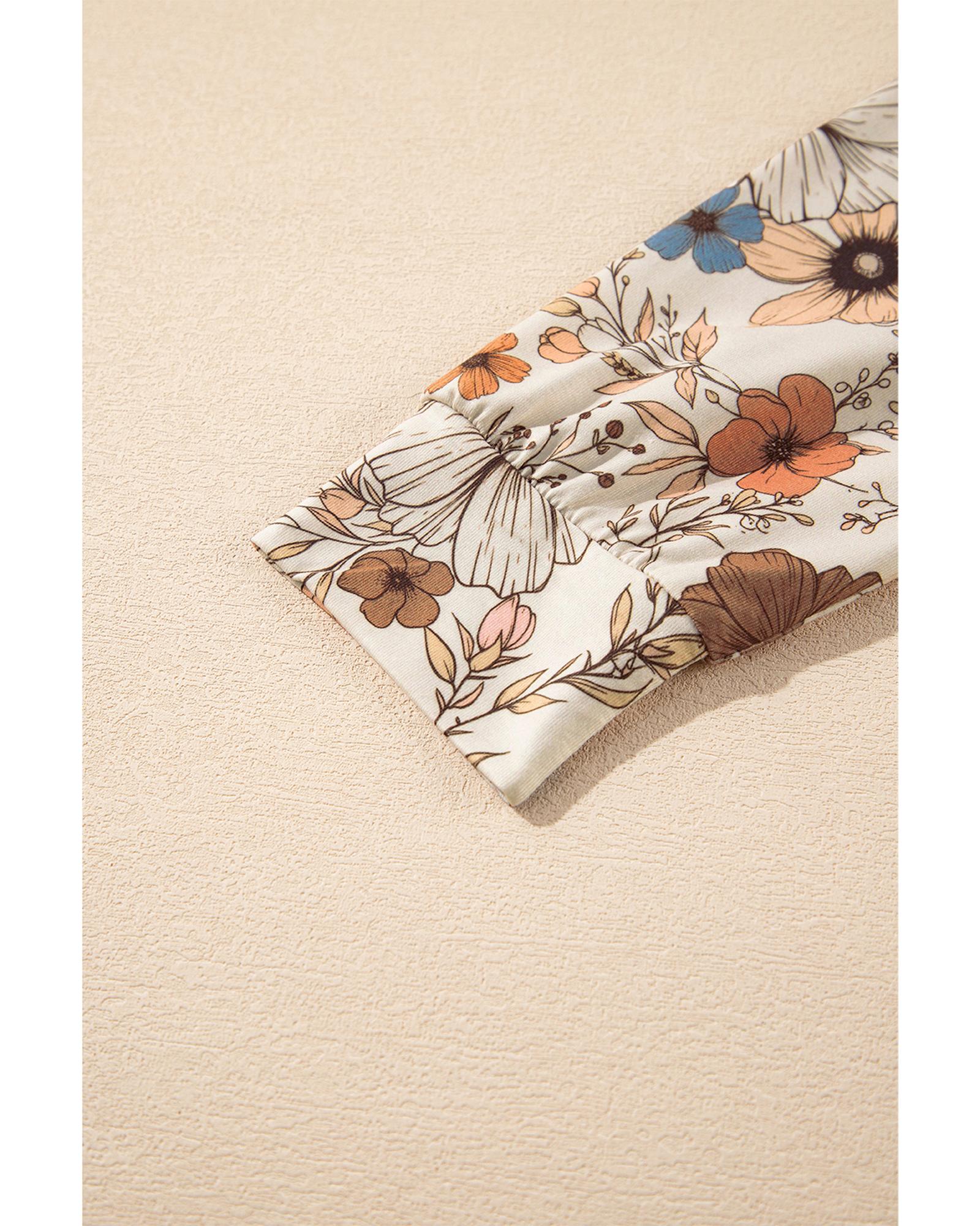 Khaki Floral Print Loose Crew Neck Long Sleeve T Shirt – L