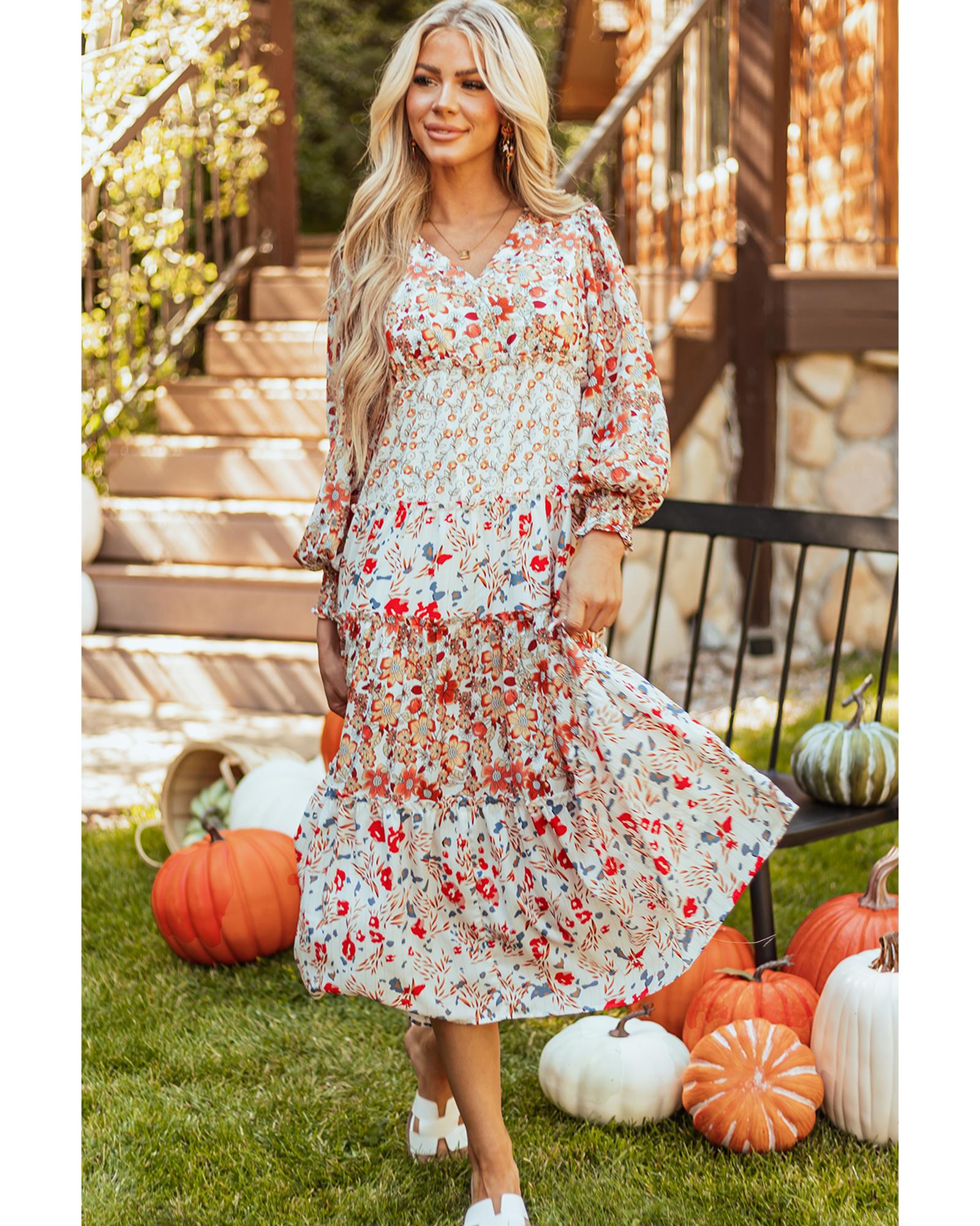 Khaki Floral Print Ruffled Tiered Long Sleeve V Neck Midi Dress – L