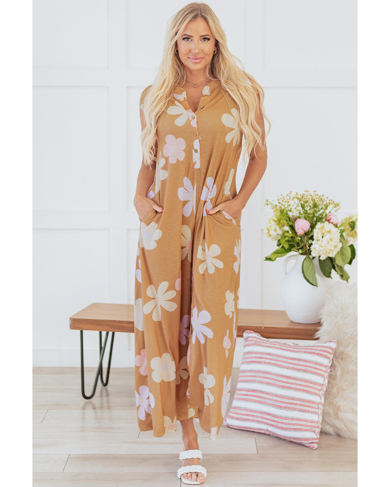 Khaki Floral Print Sleeveless Button up Wide Leg Loose Jumpsuit – L