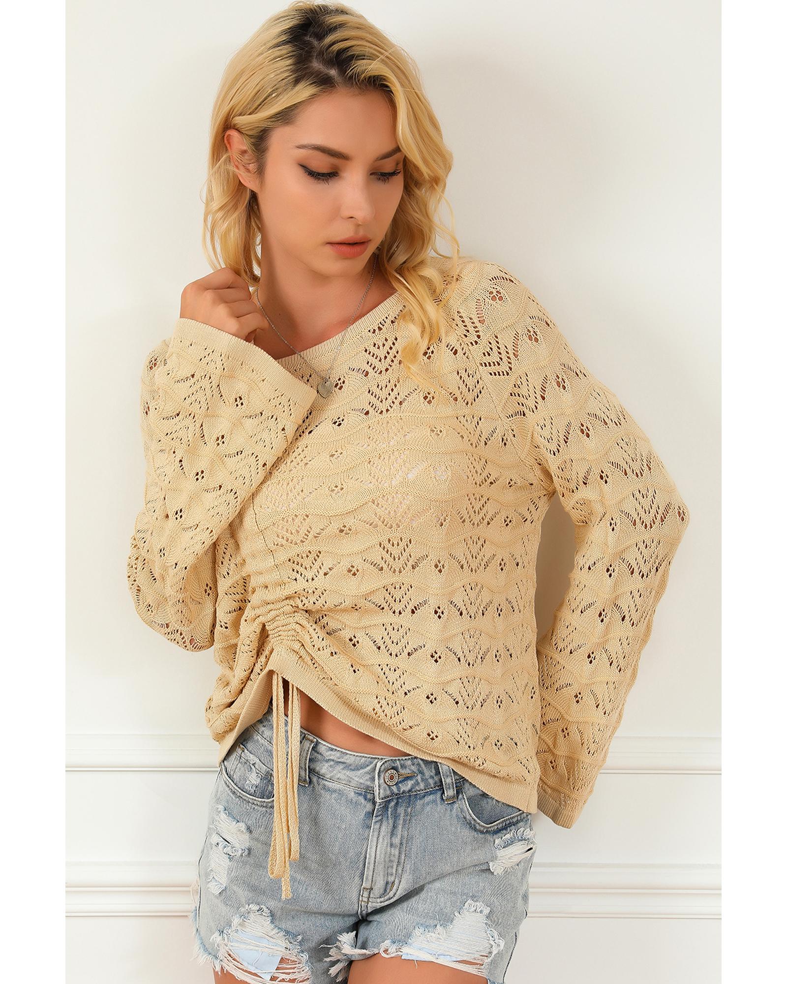 Khaki Hollowed Knit Asymmetric Drawstring Sweater – L