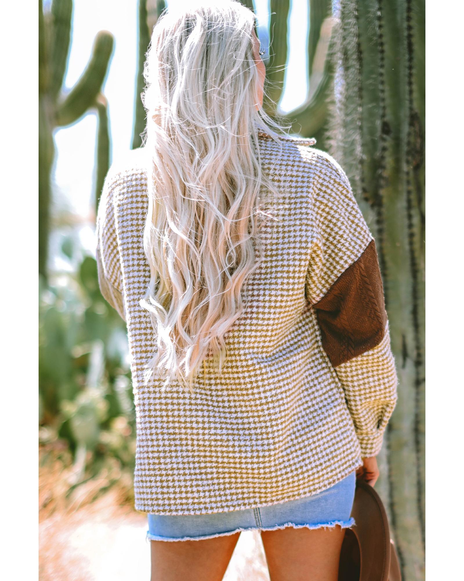 Khaki Houndstooth Color Contrast Textured Patchwork Loose Shacket – M