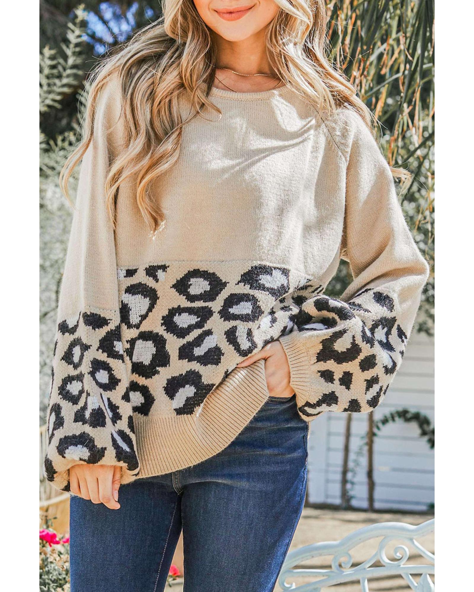 Khaki Leopard Patchwork Knitted Puff Sleeve Sweater – S