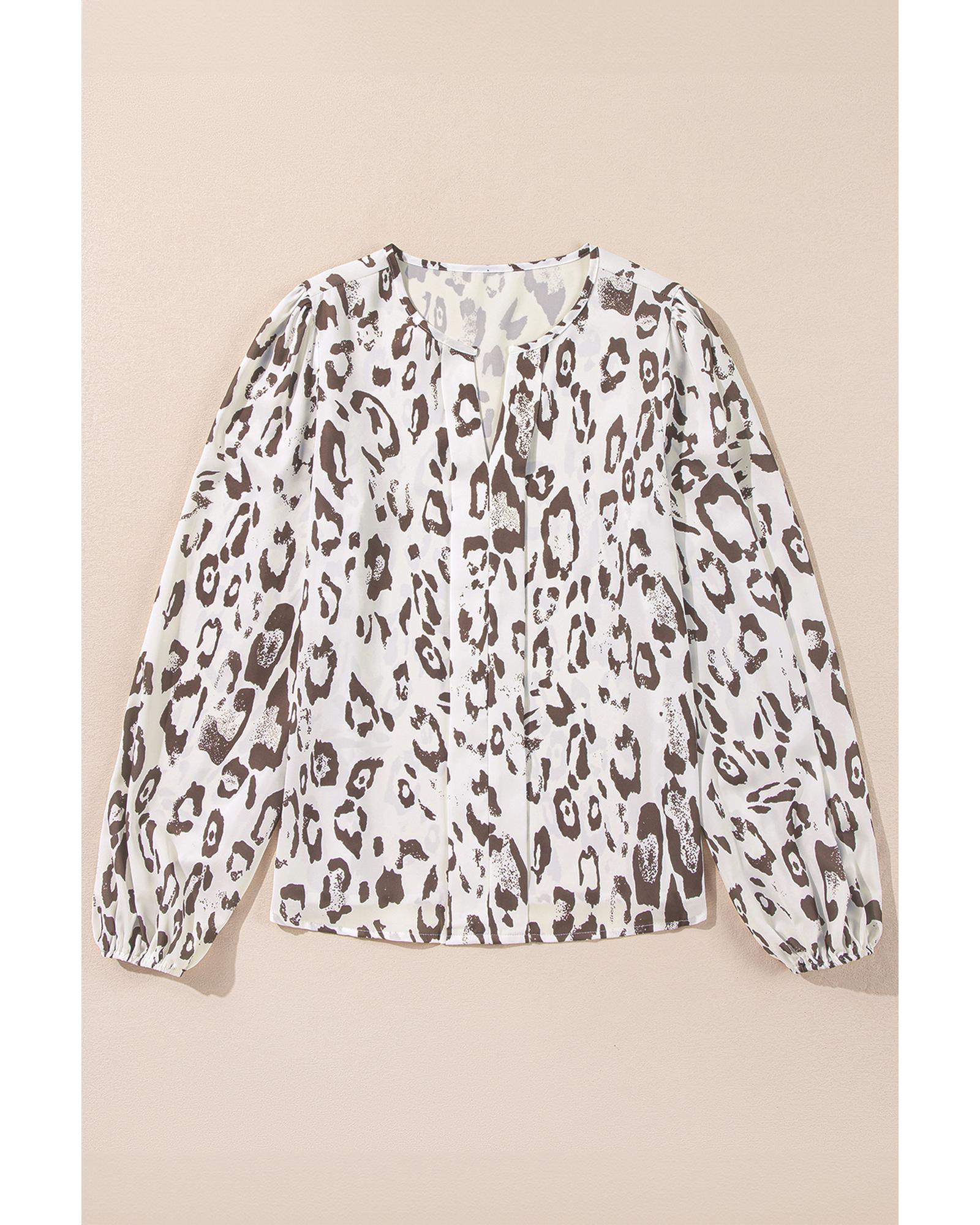 Khaki Leopard Print Split Neck Balloon Sleeve Blouse – S
