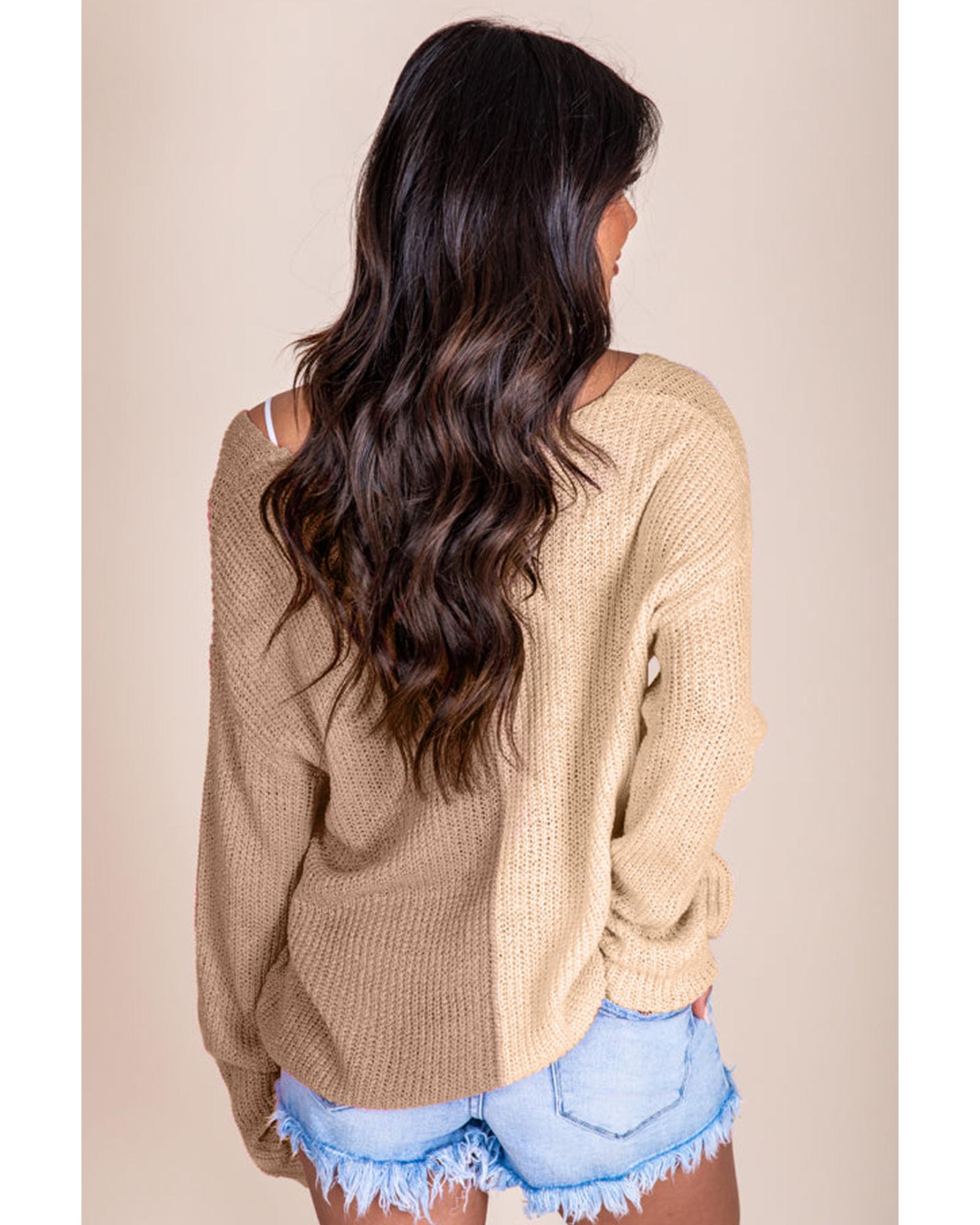 Khaki Long Sleeve V-Neck Colorblock Sweater – M