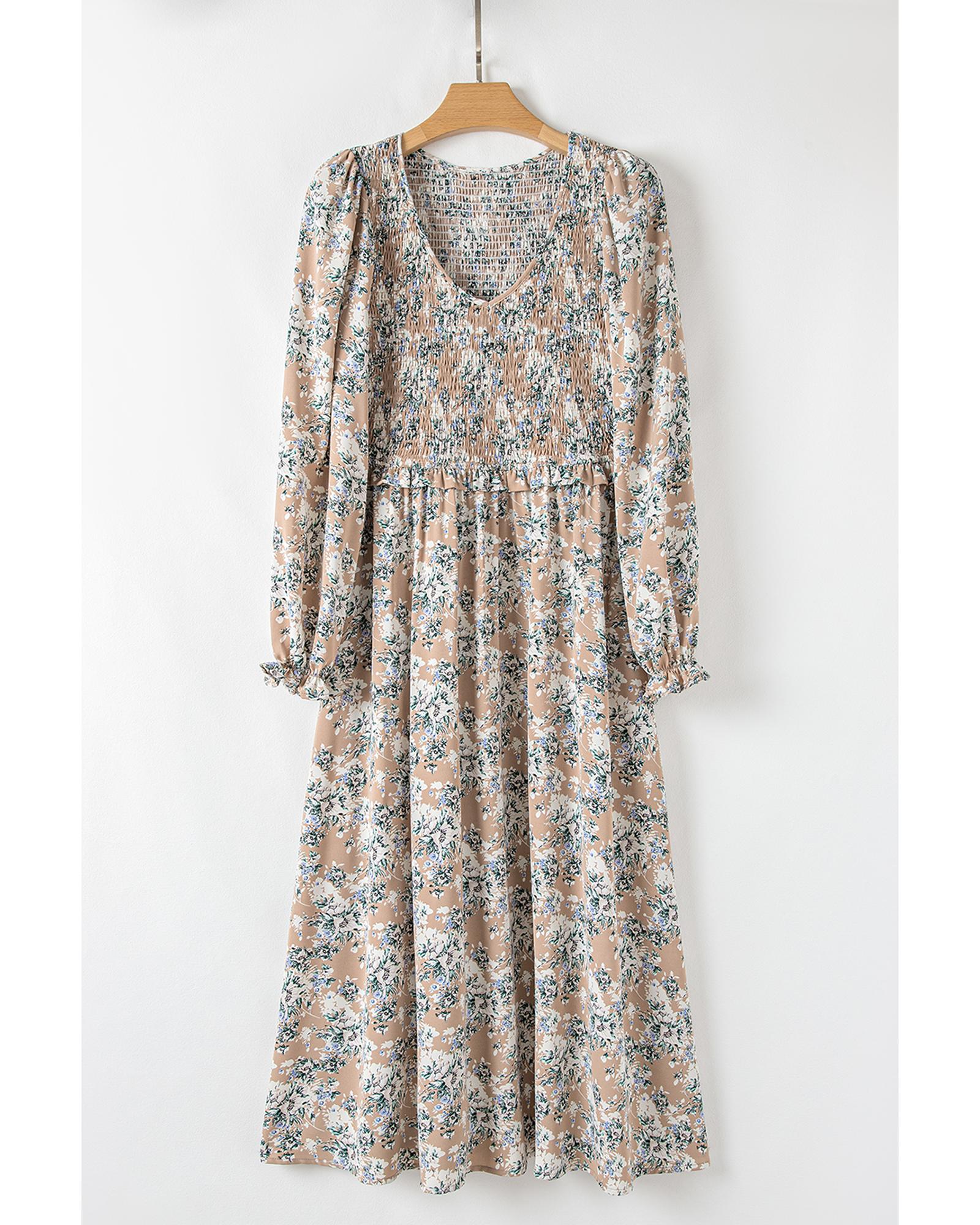 - Khaki Maple Grove Floral Smocked Puff Sleeve Long Dress