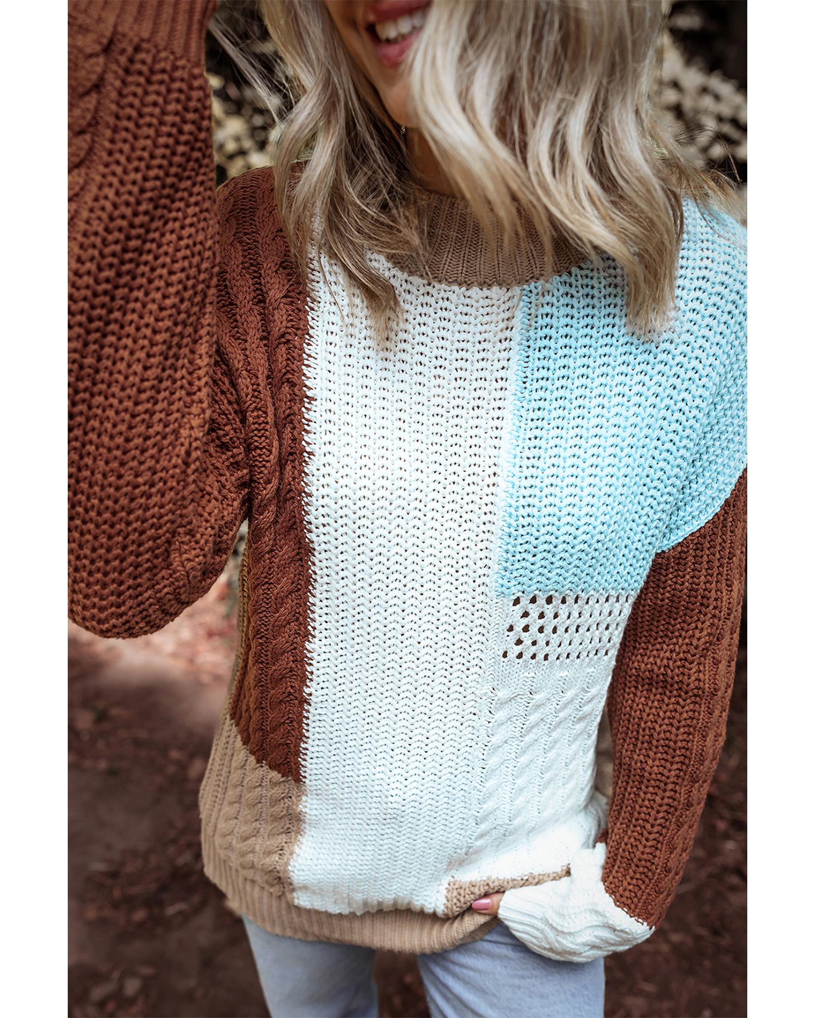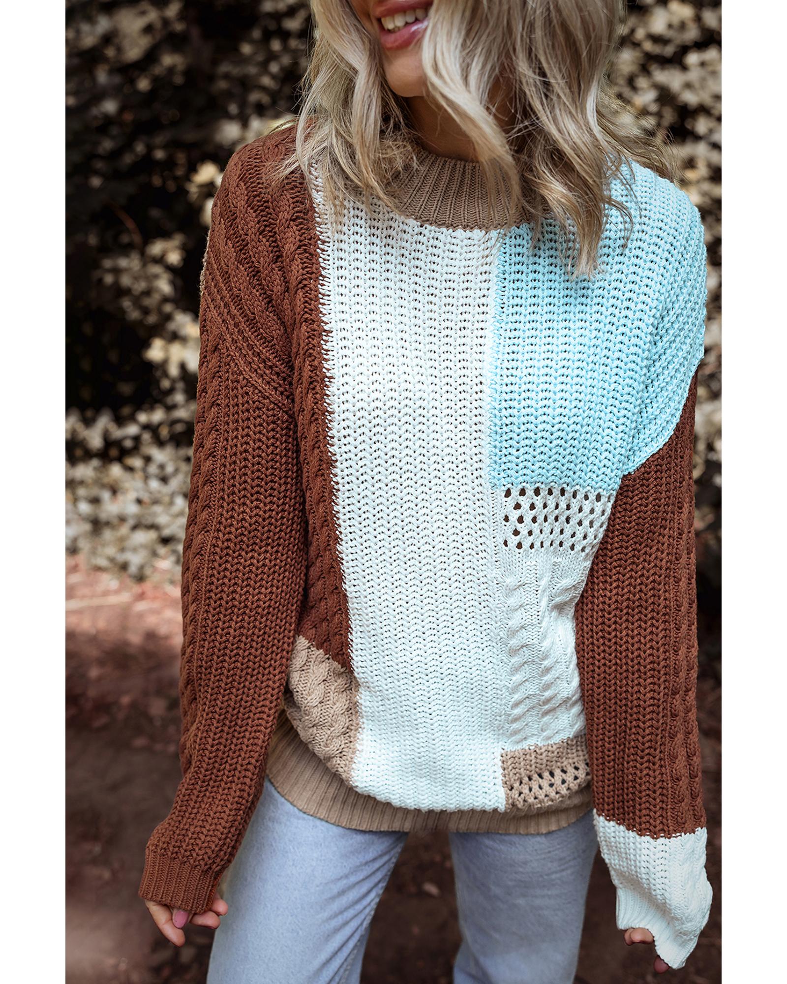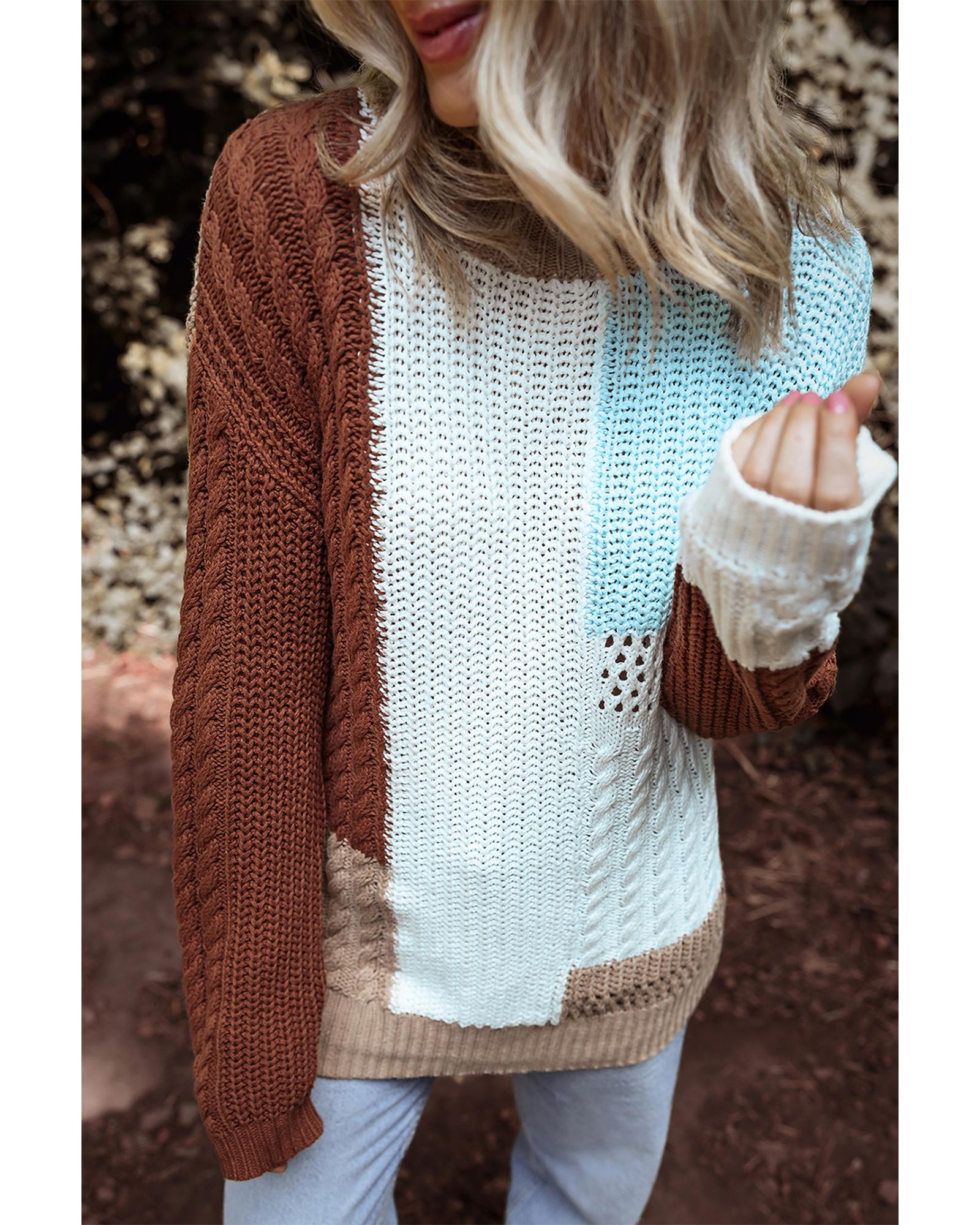 Khaki Mix Textured Knit Colorblock Patchwork Sweater – L