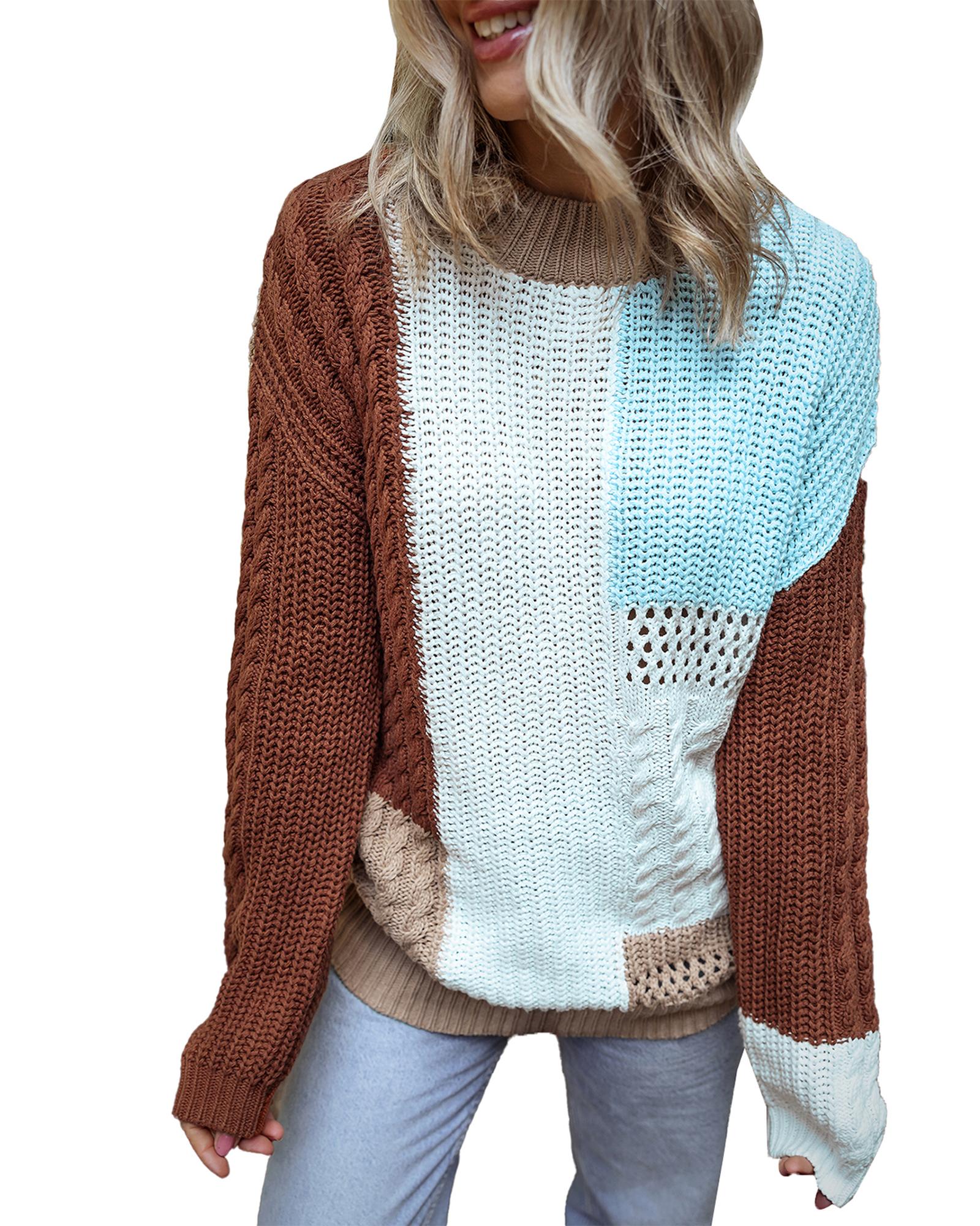 Khaki Mix Textured Knit Colorblock Patchwork Sweater – S
