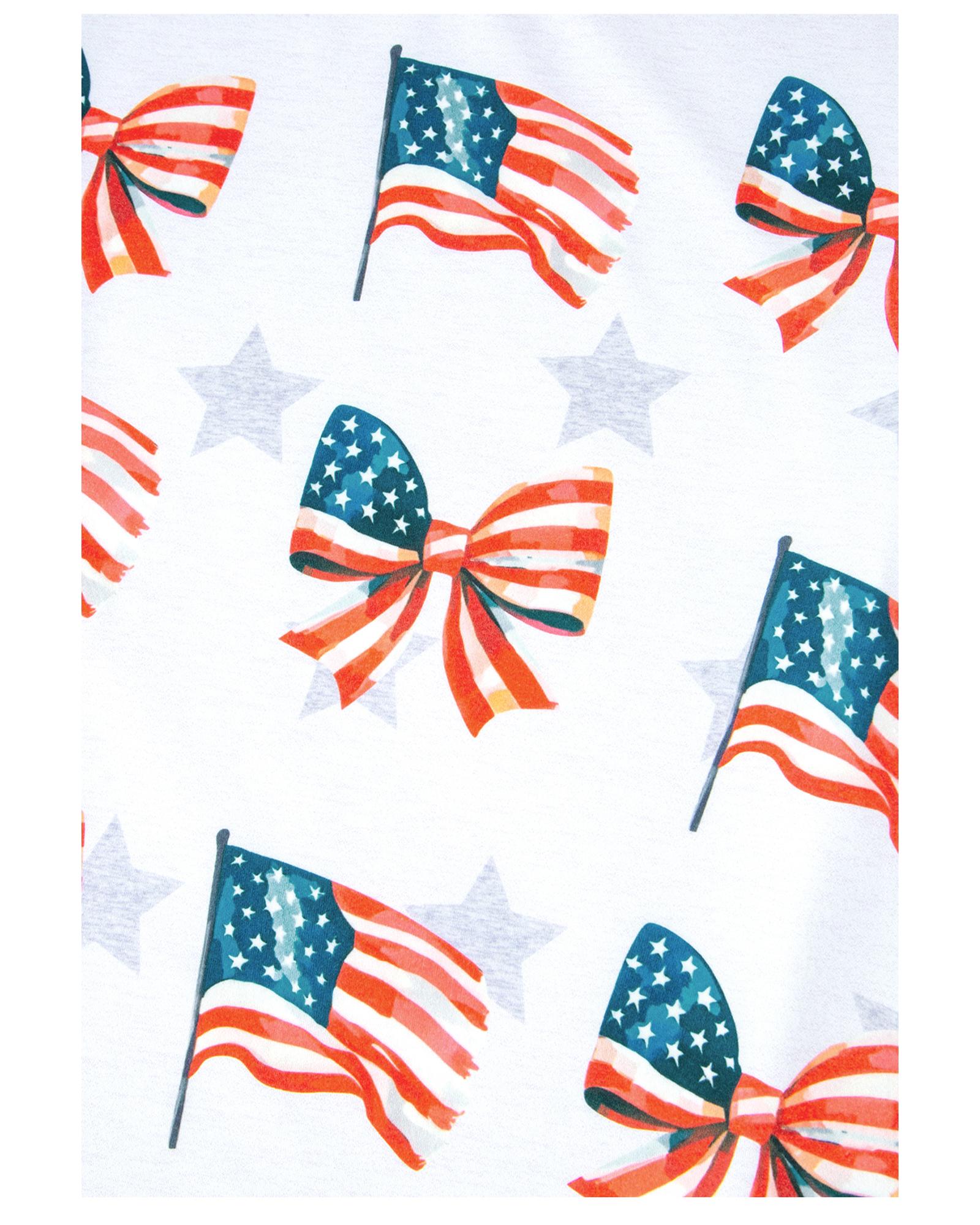 - over starry print with flag bow graphic on the front