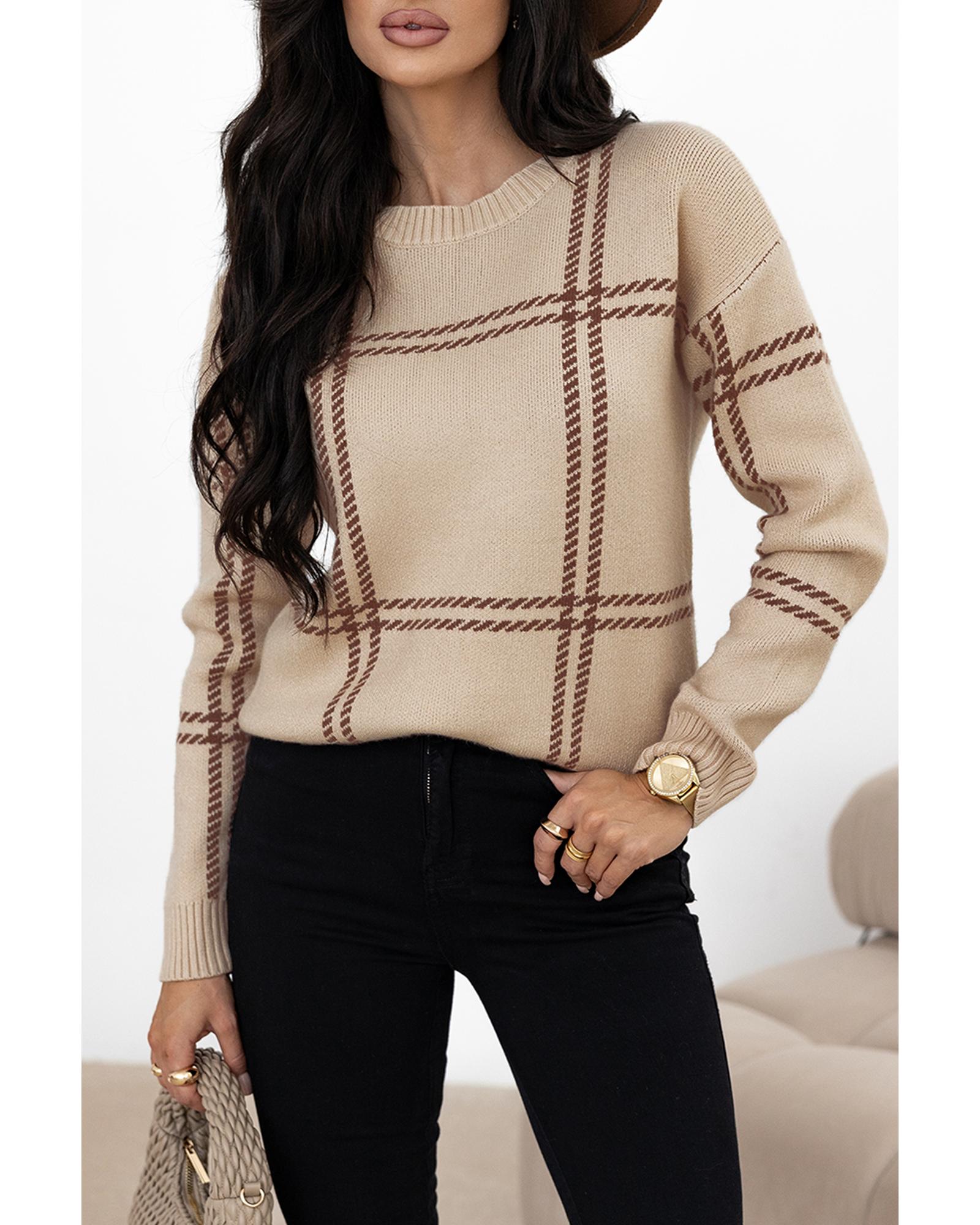 Khaki Plaid Pattern Knitted Drop Shoulder Sweater – M