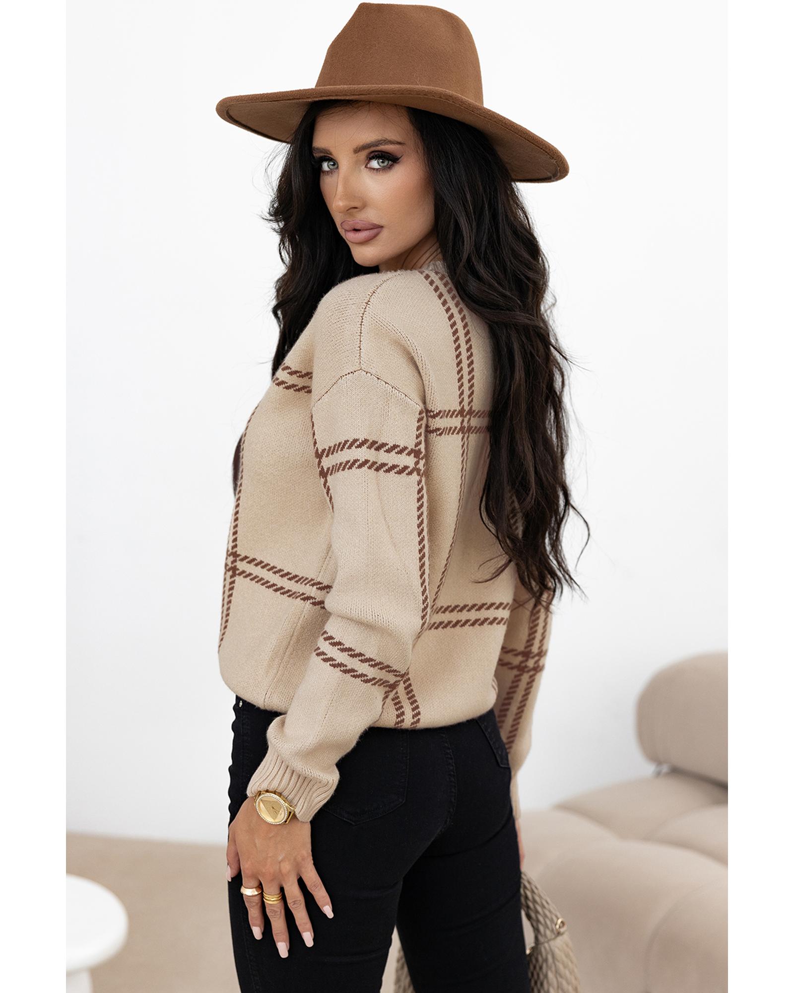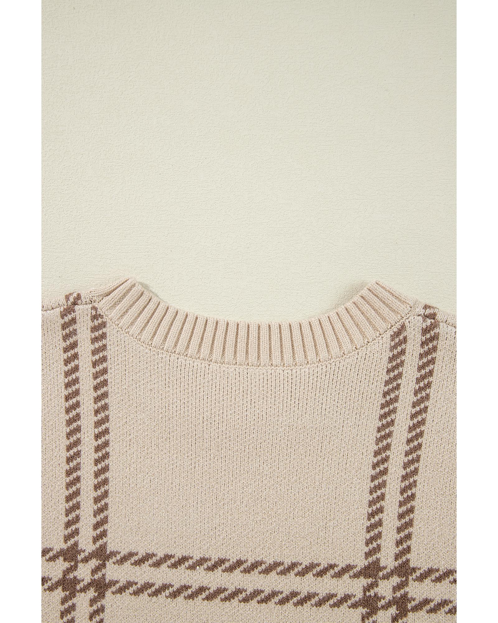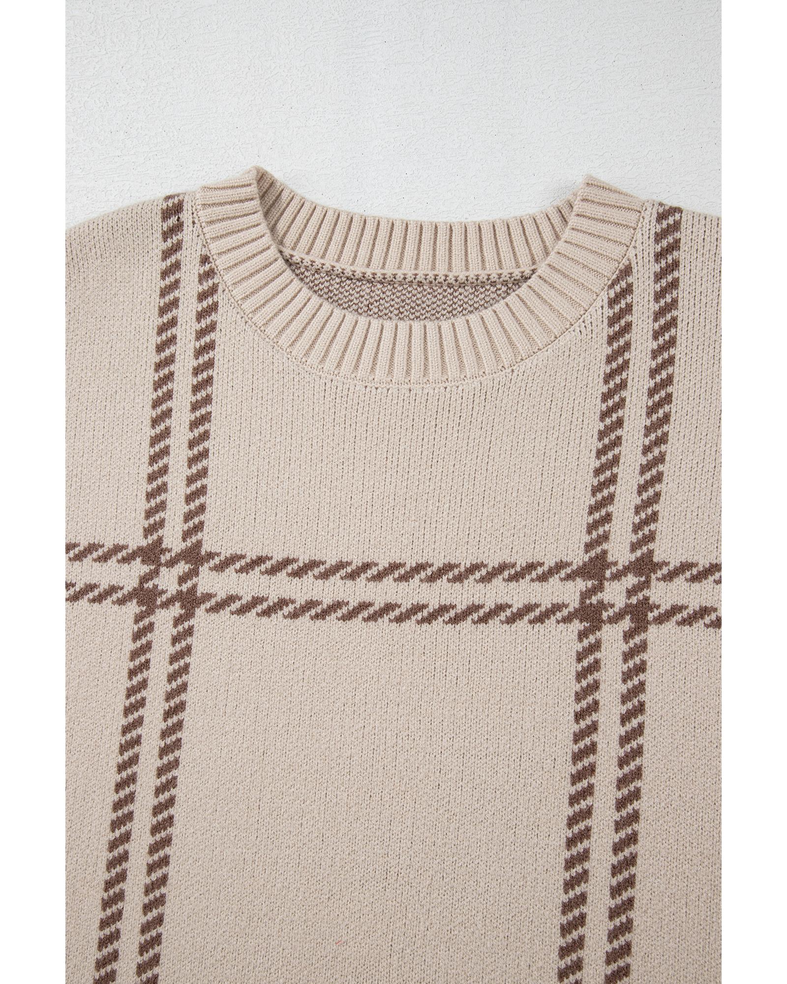 Khaki Plaid Pattern Knitted Drop Shoulder Sweater – XL