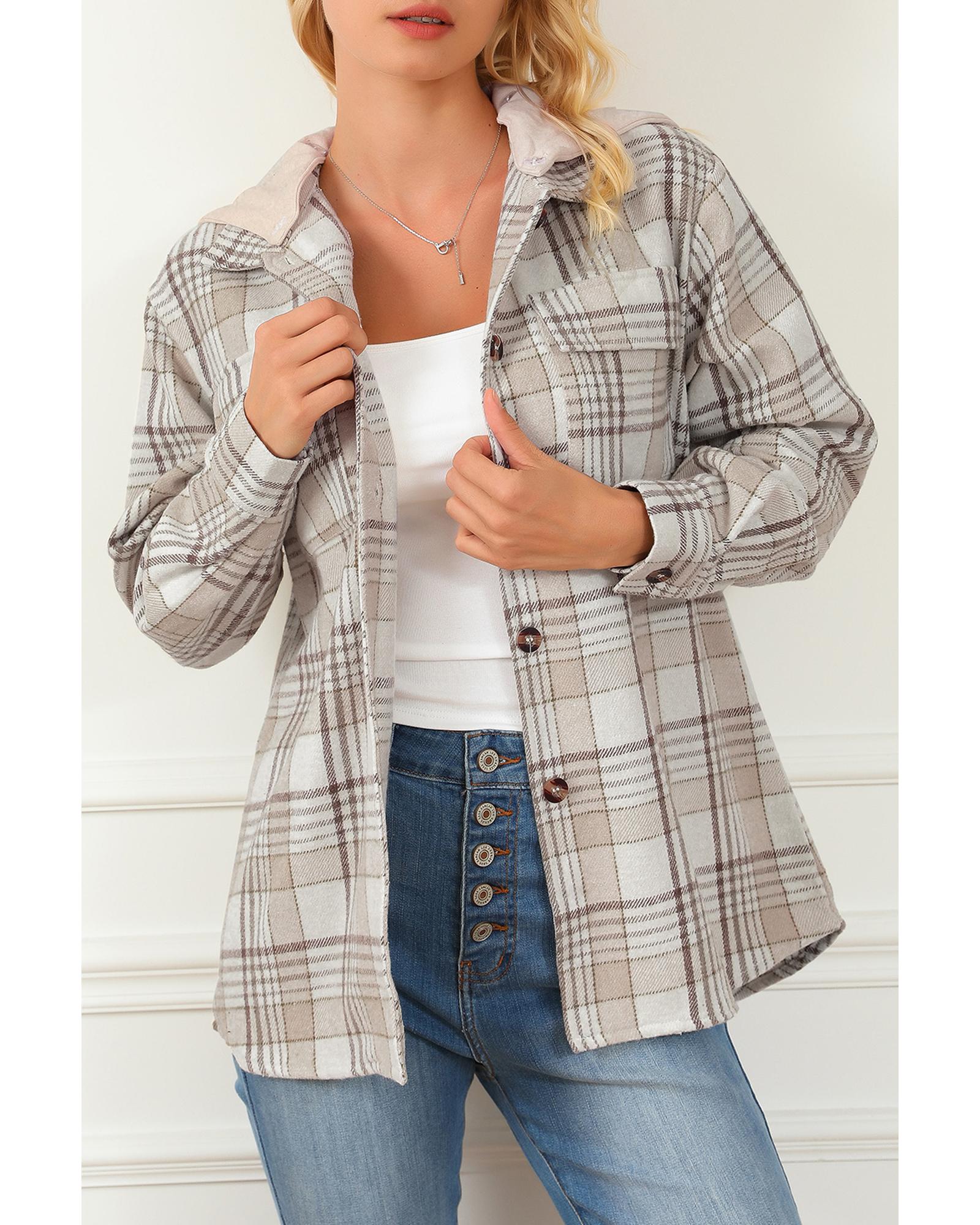 Khaki Plaid Removable Hood Buttoned Shacket – XL