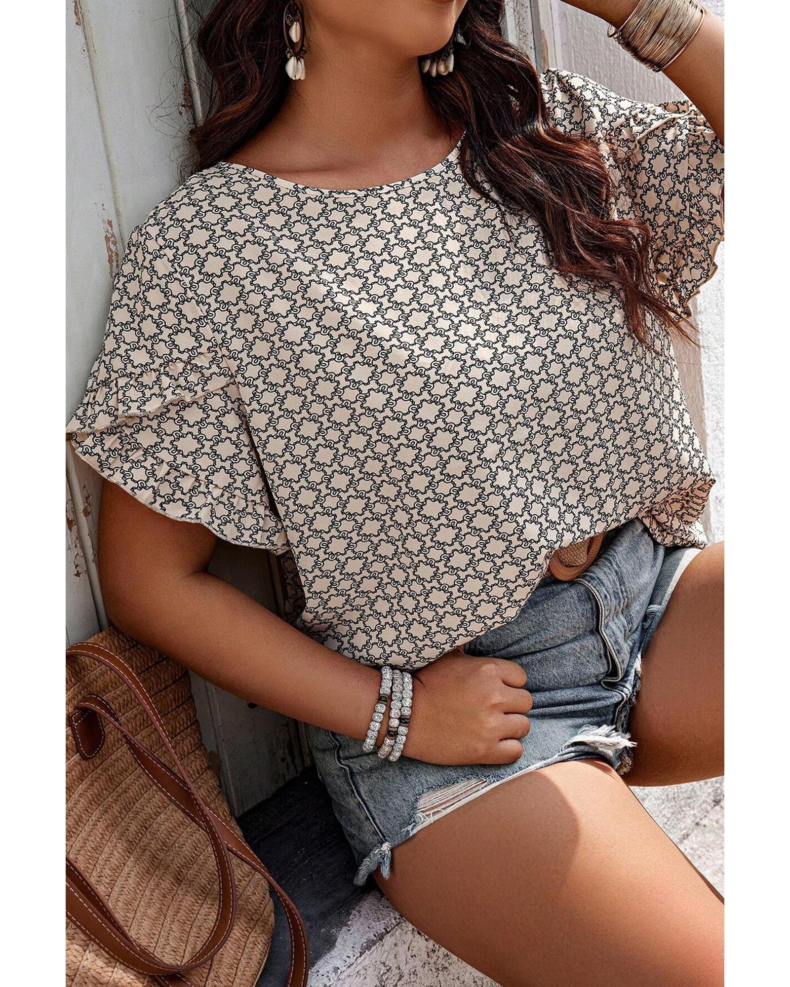 - Khaki Plus Size Geometric Print Ruffled Sleeve Blouse