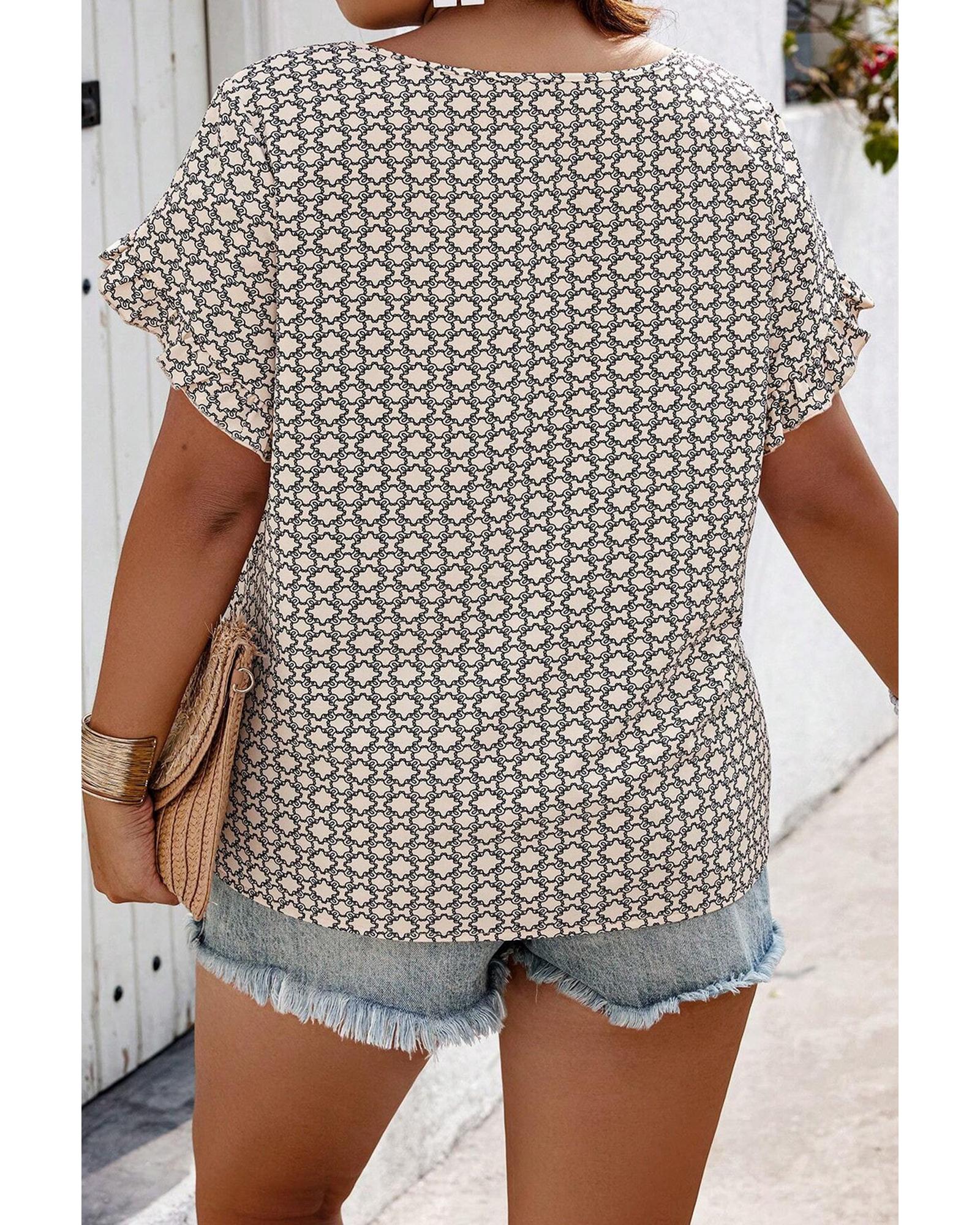 - Khaki Plus Size Geometric Print Ruffled Sleeve Blouse